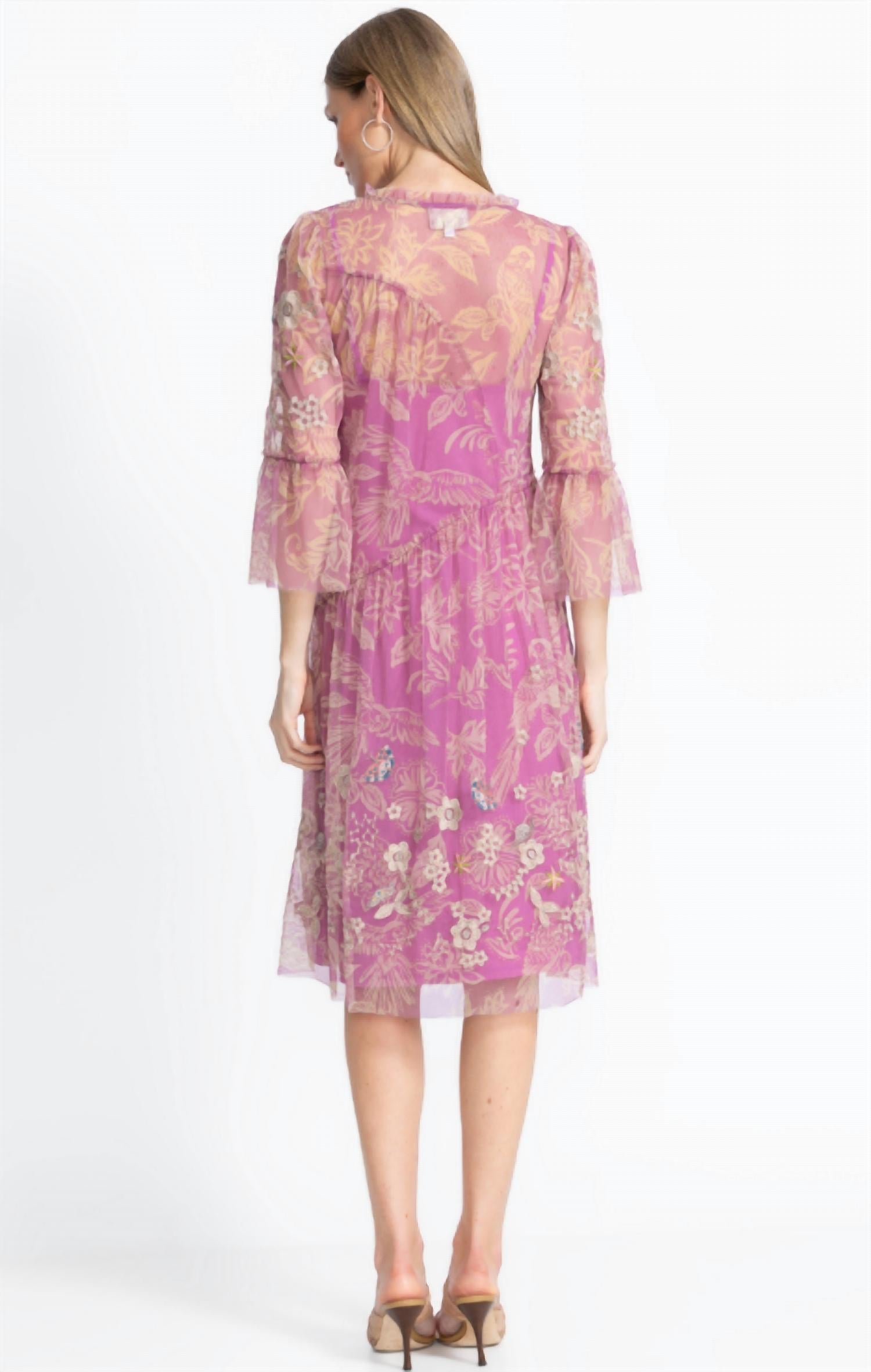 A midi dress so versatile, your options for wearing it are endless. This flowing lined maxi dress showcases intricate floral embroidery set against a soft, elegant backdrop. Designed with ruffled accents at the neckline, cuffs, and throughout the silhouette, it offers a graceful, textured look. Perfect for a polished yet relaxed style, it pairs beautifully with flats and layered jewelry.