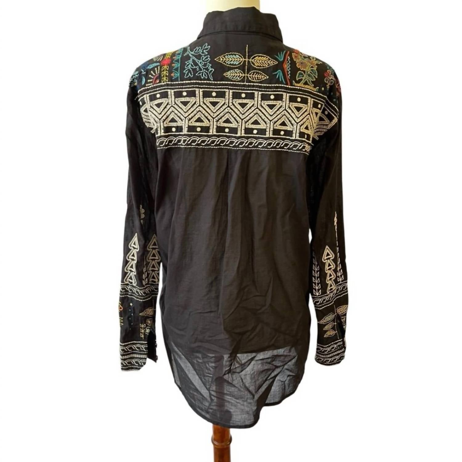 Perfectly tailored and soft to the touch. Crafted from a breathable blend of 75% cotton and 25% polyester, this oversized button-front shirt offers a beautifully feminine shirting option. It features a distinctive yoke front adorned with decorative placement embroidery and cuffed sleeves for a polished finish. Perfectly styled with leggings and riding boots, it’s a versatile addition suitable for all seasons.