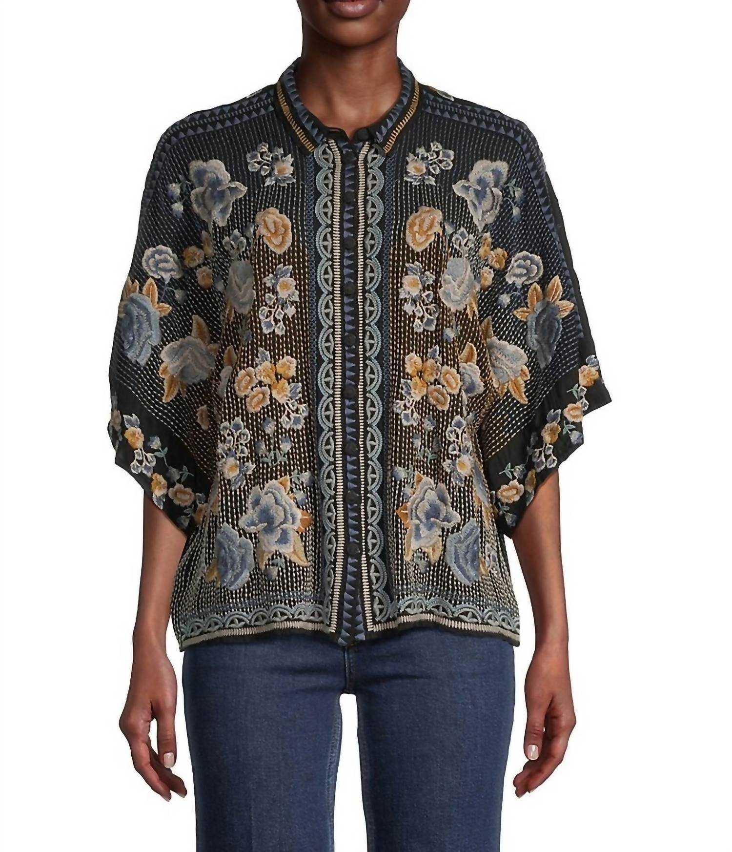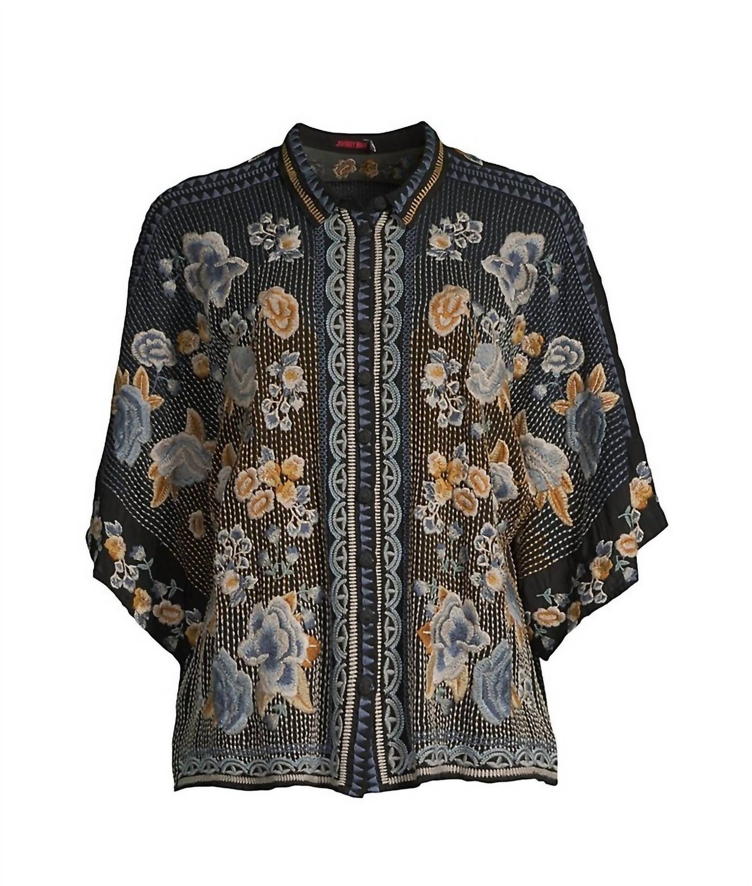 Adorned with floral embroidery. Finished with geometric trim. Spread collar. Three-quarter sleeves. Button-front closure. 100% Rayon. Hand wash. About 26" from shoulder to hem. Model is 5'10" wearing a US size Small.