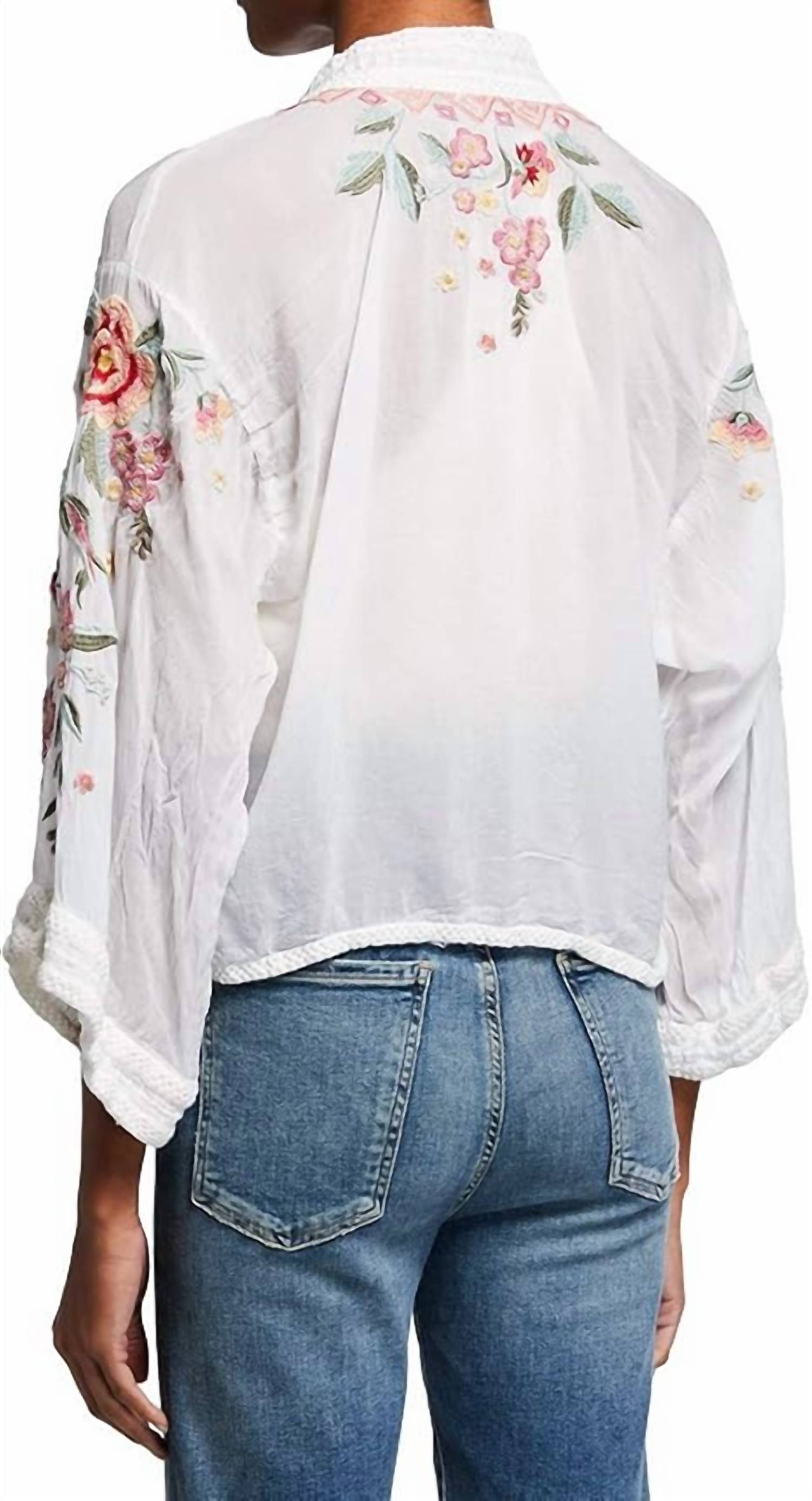 This cardigan will be a sweater-rotation favorite. Introducing the Aurora Kimono by Johnny Was, a boho chic piece perfect for summer vacations. This women's cardigan in white features a floral pattern and a stylish V-neckline. Crafted from soft rayon with long sleeves, it offers a relaxed pull-on closure. For easy maintenance, simply machine wash as needed.
