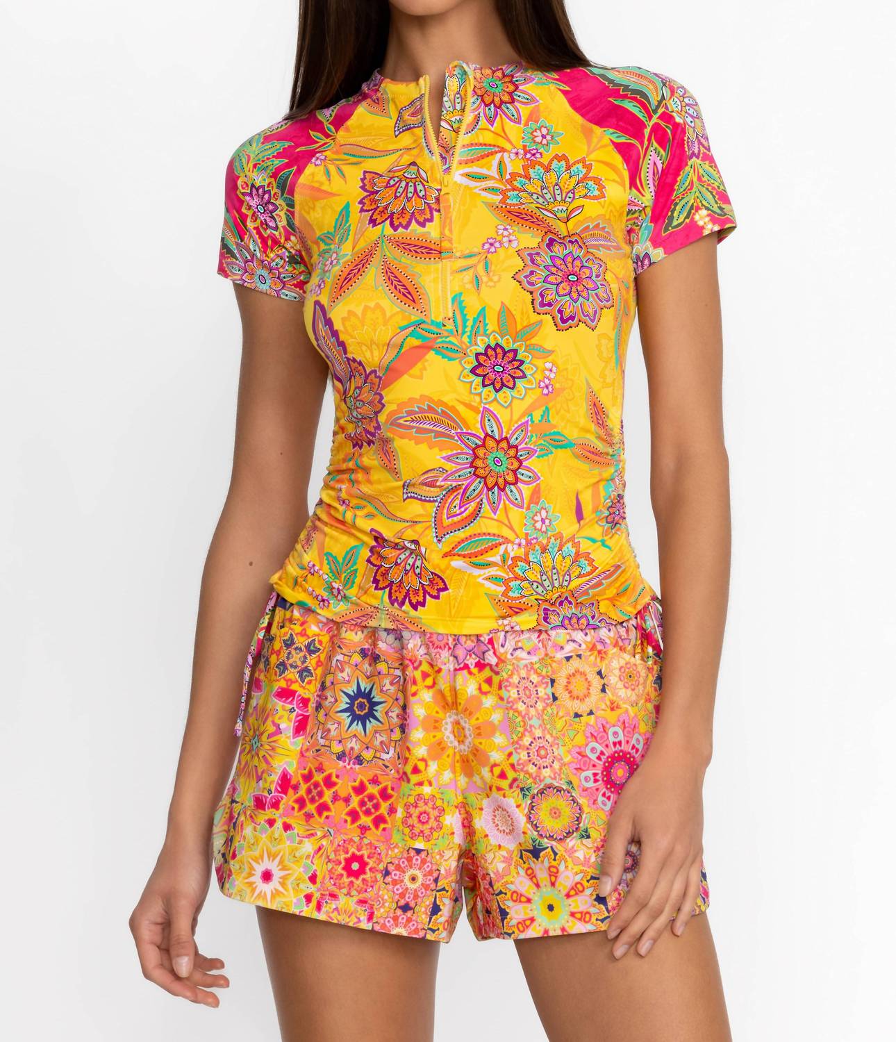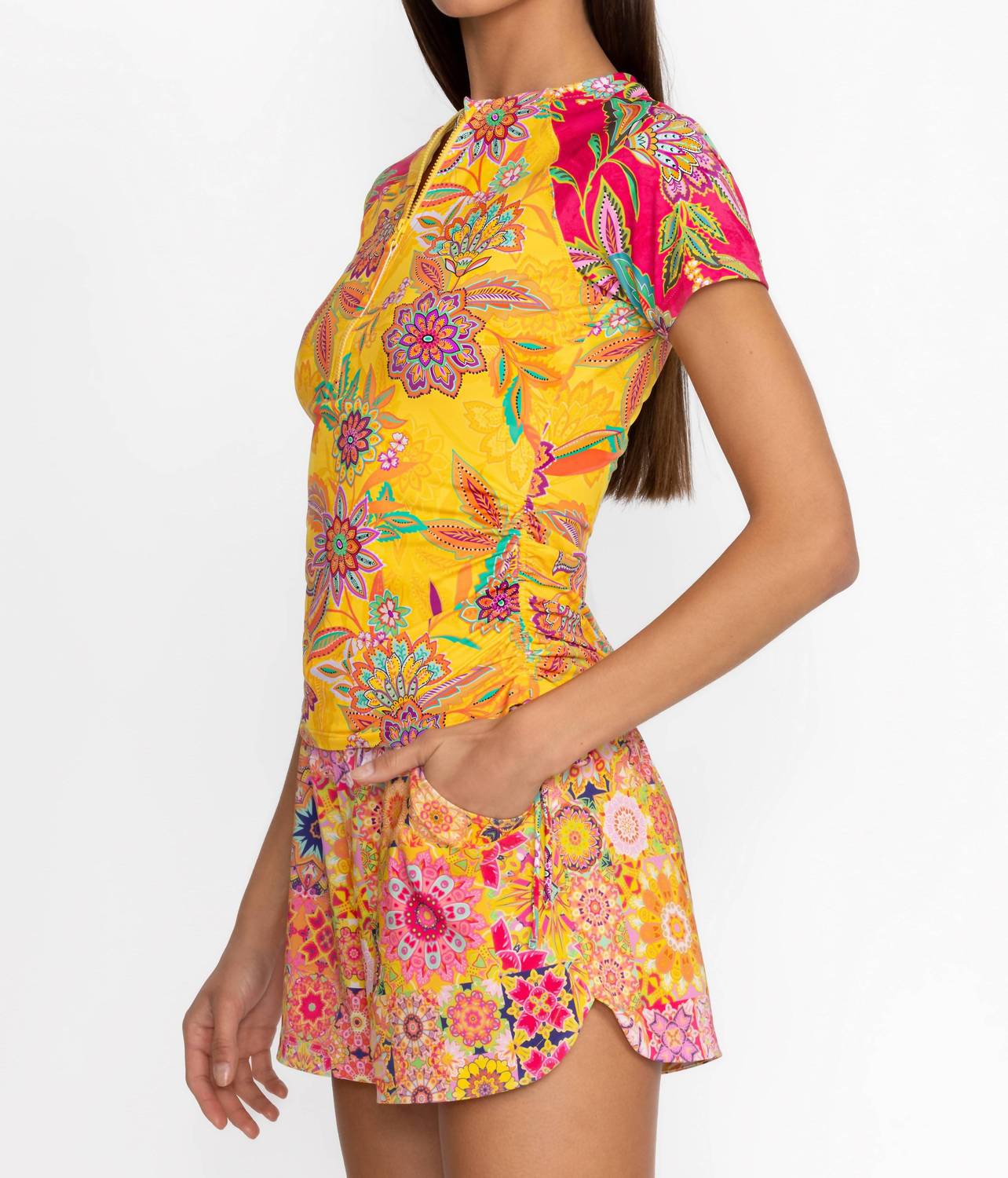 Fit to perfection, we love these high-waist shorts and you will too. Embrace the vibrant mood of summer adorned with lively floral patterns for a boho chic beach adventure. Designed for women, offer a high-waist fit with a comfortable pull-on closure and convenient side pockets. Crafted from a stretchy 90% Polyester and 10% Spandex blend, and featuring a 3-inch inseam, provide enhanced coverage for seasonal fun. Care involves rinsing in cold water after use and hand washing cold separately to maintain their vivid colors.