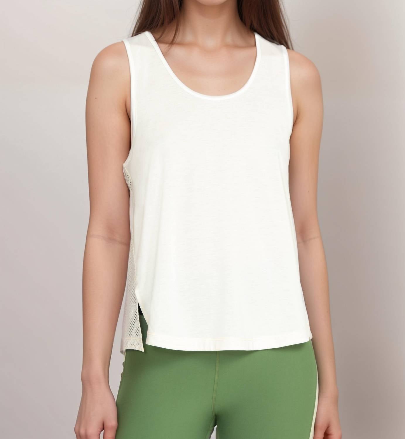 This classic tank top is perfect for layering and cute enough to wear on its own. Introducing the Calme Effect Mesh Contrast Tank by Johnny Was, a chic essential in tofu, perfect for your activewear collection. This sleeveless tank top boasts a luxurious blend of 83% Polyester, 11% Lyocell, and 6% Elastane, providing a soft and breathable feel. Expertly crafted with mesh panels on the sides and back, it features a pull-on closure and a flattering scoop neckline for seamless styling. Made in China, this tank is machine washable for easy maintenance.