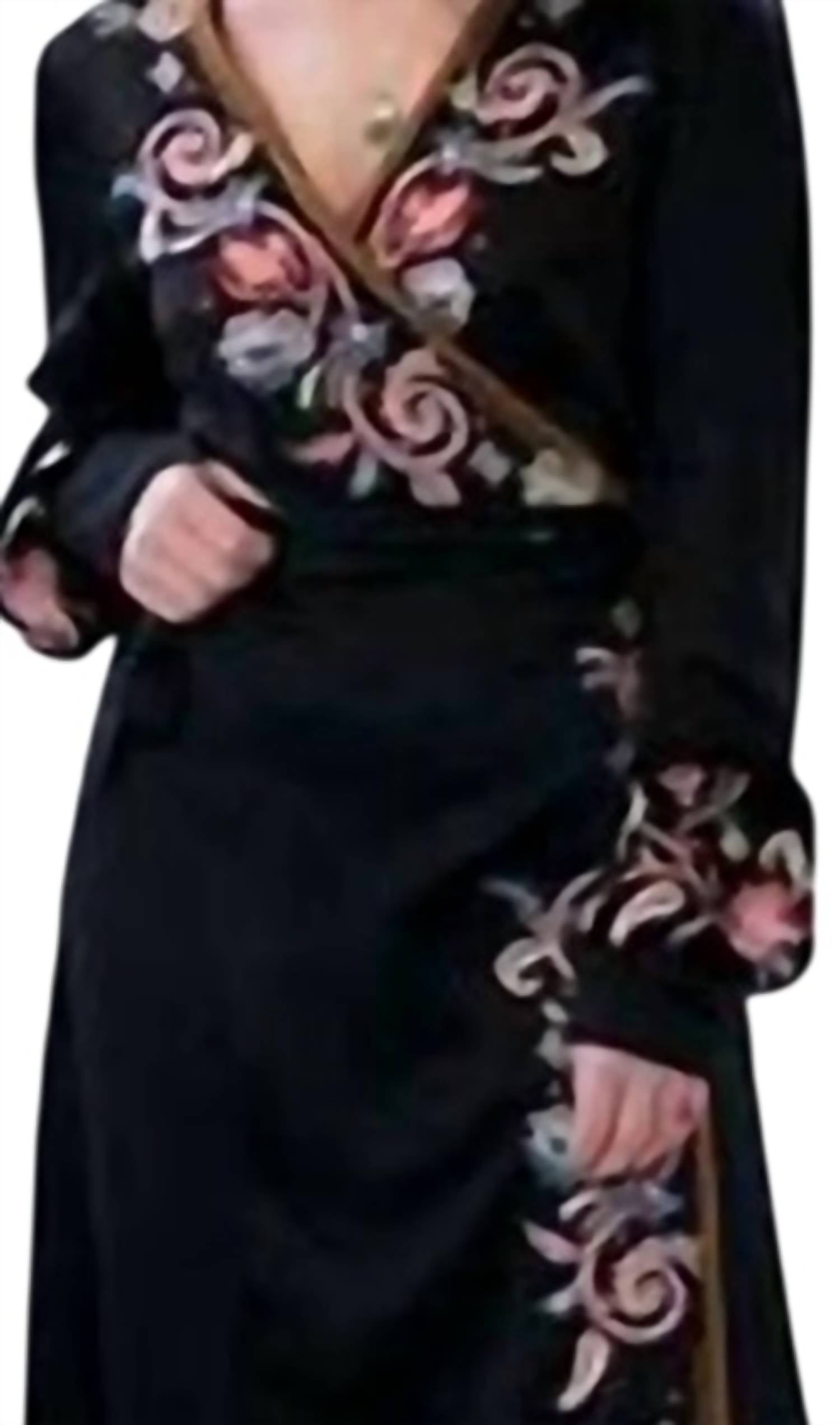 Style this maxi with your favorite statement necklace and sandals for the perfect look. The Johnny Was Esme Puff Sleeve Wrap Dress in black features a wrap-style design with puffed long sleeves. It is adorned with colorful floral embroidery on the bodice, sleeves, and along the side of the skirt. The dress has a flattering V-neckline and a flowing maxi length, combining elegance with a bohemian touch.