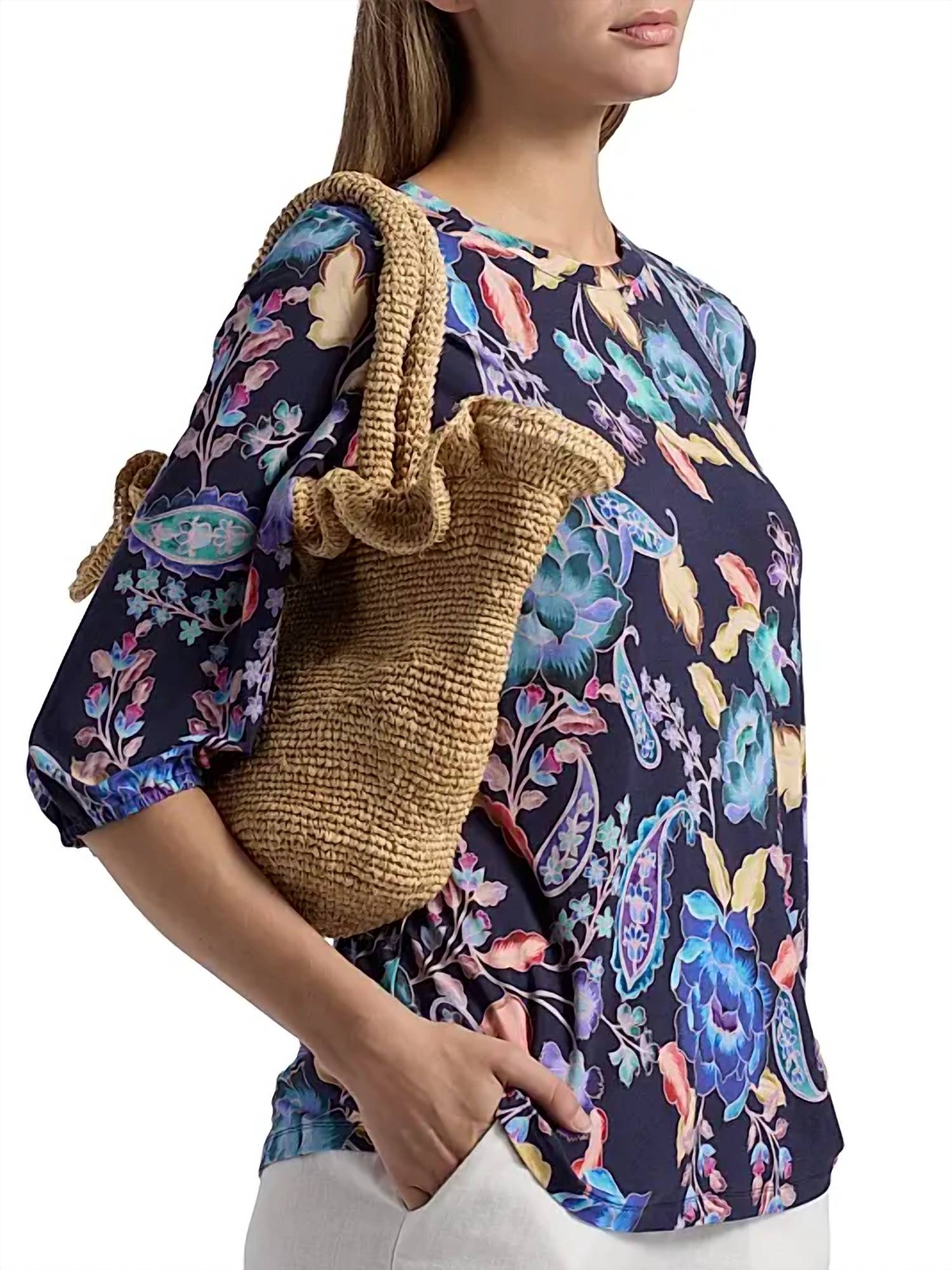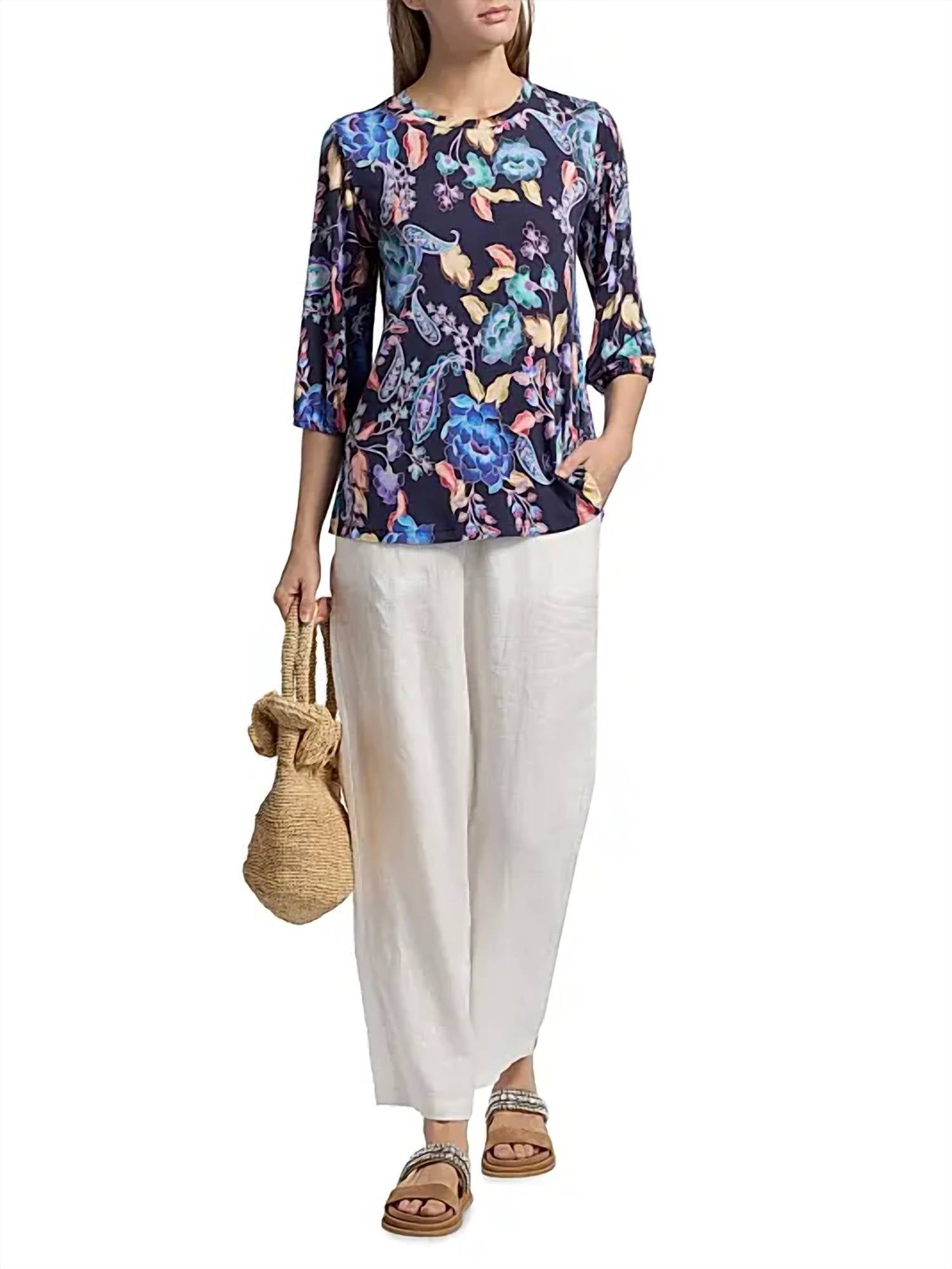 Pair this with your favorite jeans and slides for your next girls night out. Embrace boho chic style with the Johnny Was Janie Favorite Top, featuring floral prints in the Stevies Garden colorway. Designed with stylish elbow-length puff sleeves, this blouse offers a crewneck for comfortable wear. Pattern: Floral. Closure: Pull on. Care: Hand wash only. Ideal for the summer season, this piece embodies effortless elegance with its women-oriented design.