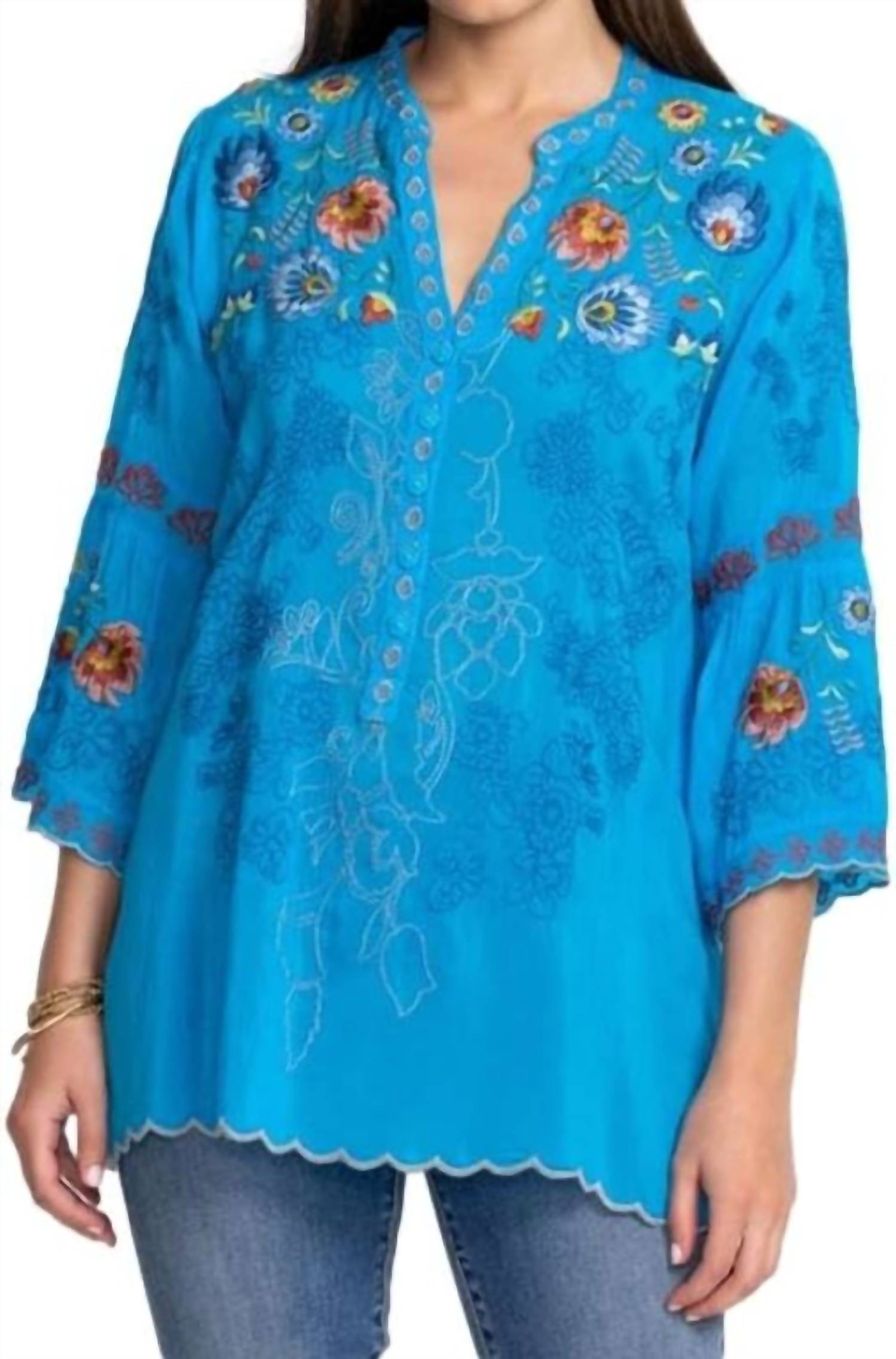 A versatile blouse that works from desk to dinner! Elevate your spring wardrobe with the Johnny Was Maverick Blouse, a vibrant addition in Blue Danube. This boho chic top features a floral pattern and a flattering V-neck, perfect for a holiday party or any special occasion. With three-quarter sleeves and a convenient pull-on closure, it ensures both style and ease. Made from 100% Rayon, it is machine washable and can be tumble dried for hassle-free care.