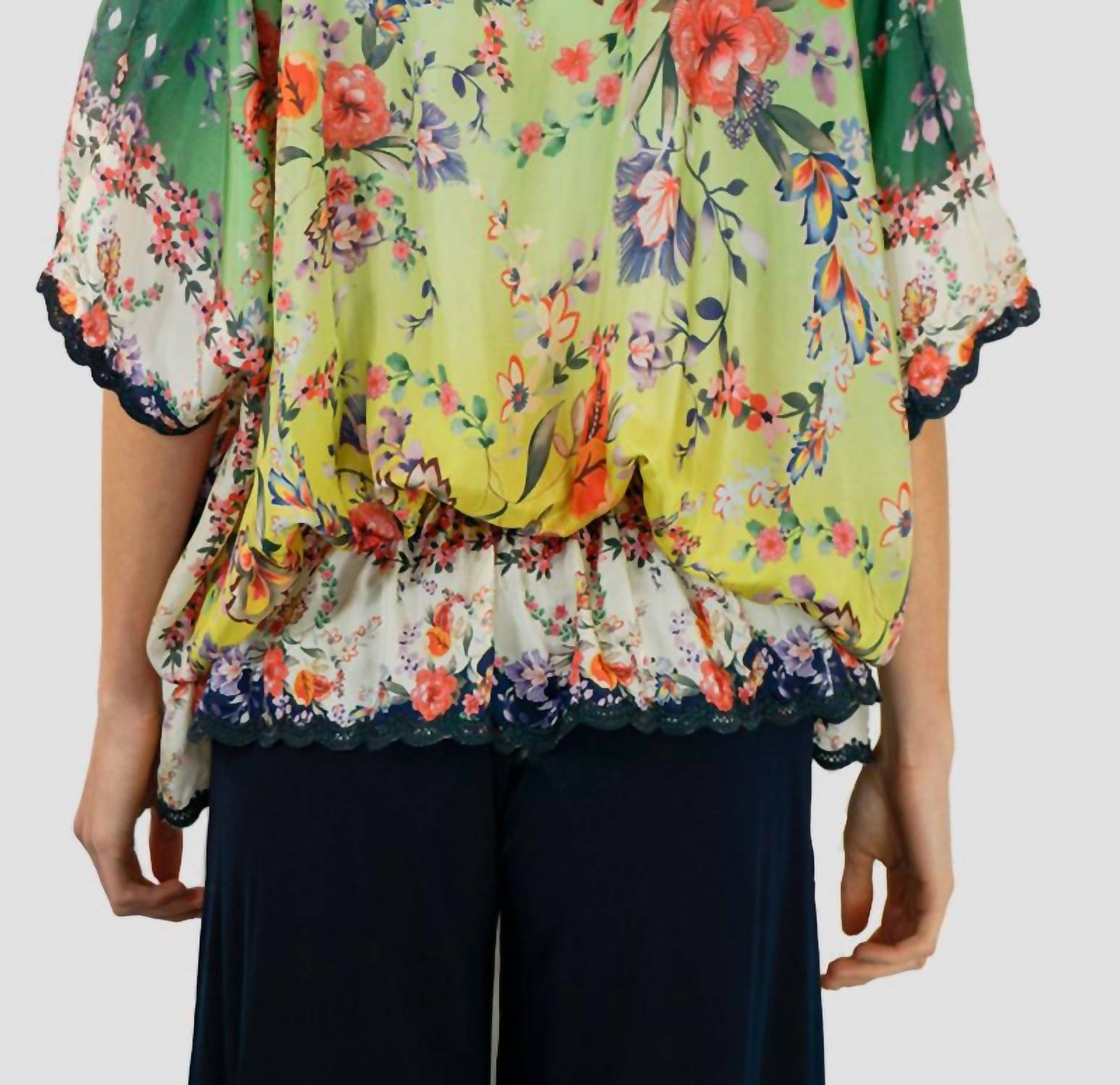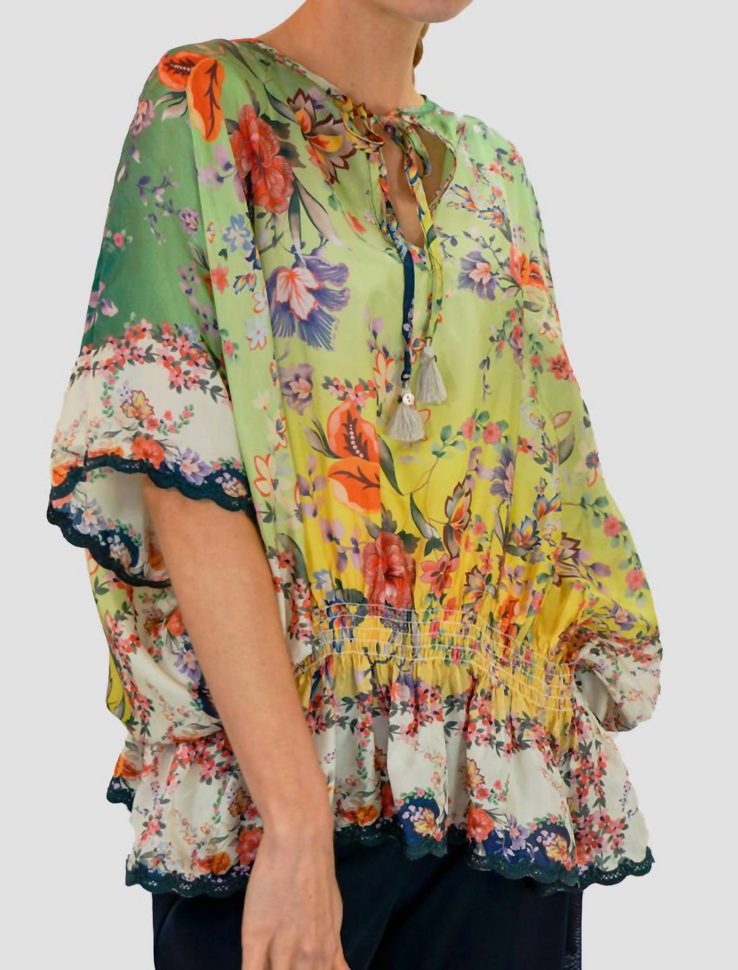 A timeless blouse that will never go out of style. The Maypo top blends bohemian charm with a refined aesthetic, offering an effortless and versatile look. It features a notched V-neck with tassel ties, elbow-length sleeves, a smocked drop waist, and a flutter hem. Detailed with an allover floral print and scalloped embroidered trims, it’s a perfect balance of relaxed elegance and intricate design.