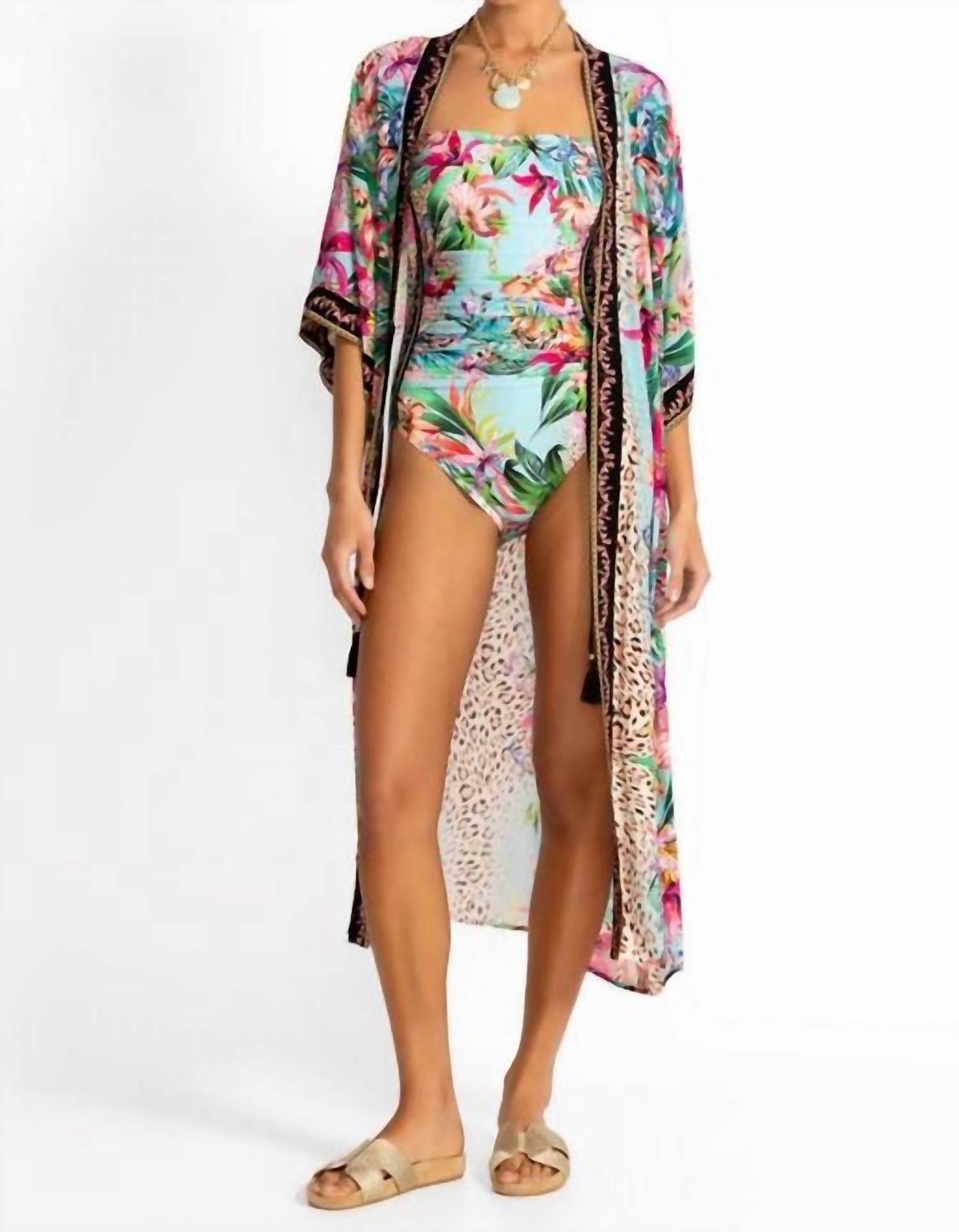 A comfy-all-day coverup that works just as good at dinner as it does by the pool. Beautifully embellished with vibrant florals, the Miller Long Kimono is crafted from lightweight, flowing fabric. Featuring a contrasting trim at the neckline, it is cut with a front tie closure and flowing 3/4 sleeves. The model is 5'10" and wearing a size Small. Machine Wash