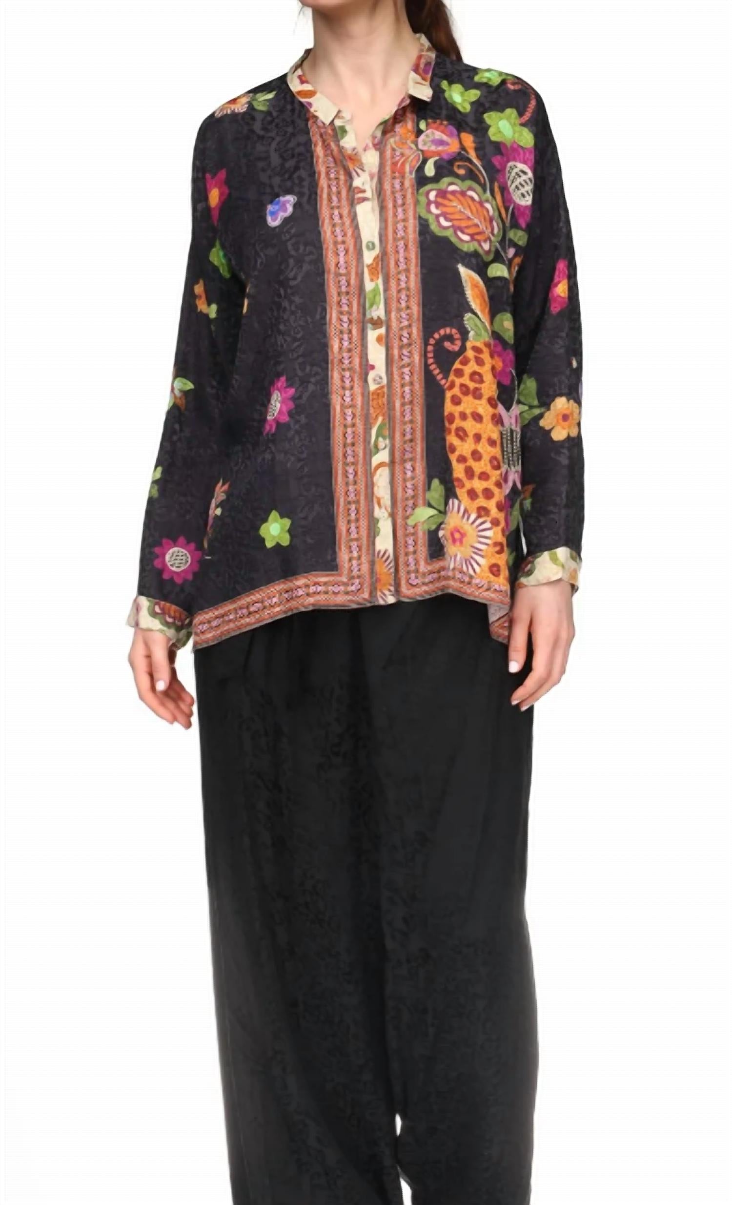 A classic button down shirt that will never go out of style. Introducing the Oversized Audrey Shirt by Johnny Was, a stylish choice for an effortlessly chic look. Crafted with long sleeves from a luxurious 82% Rayon and 18% Silk blend, this shirt features a graphic retro-inspired pattern with burnout detailing. The button-front design and drop shoulder offer a relaxed, boyfriend silhouette with dimensions for a size medium listed as 47" bust and 27 1/2" front length. Care: Dry clean only.