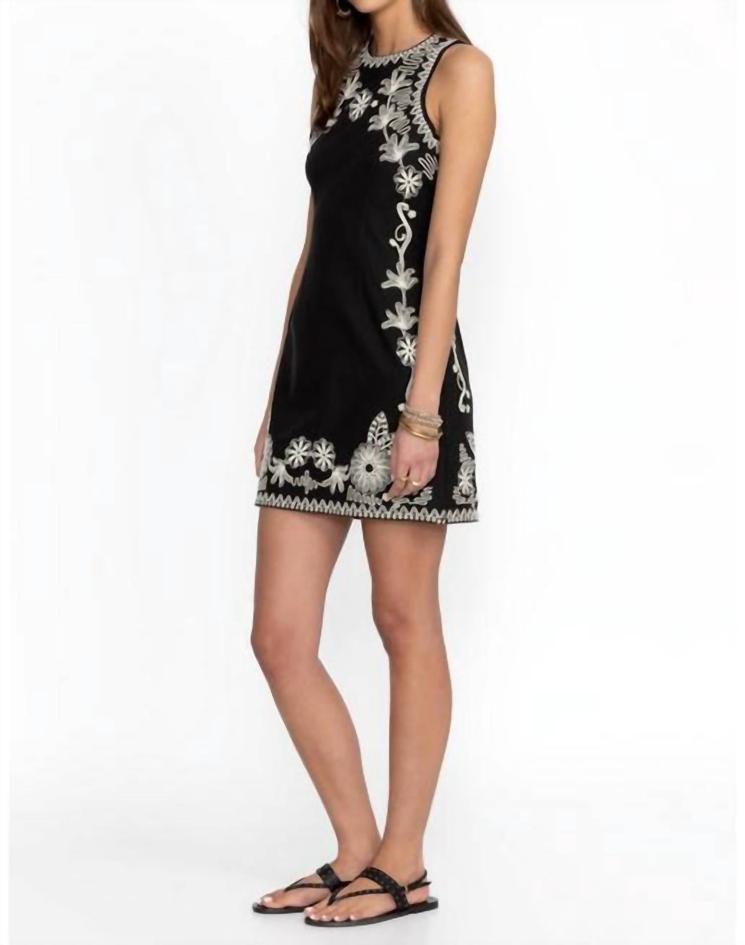 The perfect mini dress for those warmer months. The Kimber Raumi Mini Dress is made from a lightweight, airy blend of linen and cotton with a touch of stretch. It features a rounded neckline adorned with intricate embroidered detailing and a zipper closure at the back. The model is 5'11" and wearing a size 8. Measurements for size 8: Bust - 36 1/2", Front Length - 35 1/4" Dry Clean