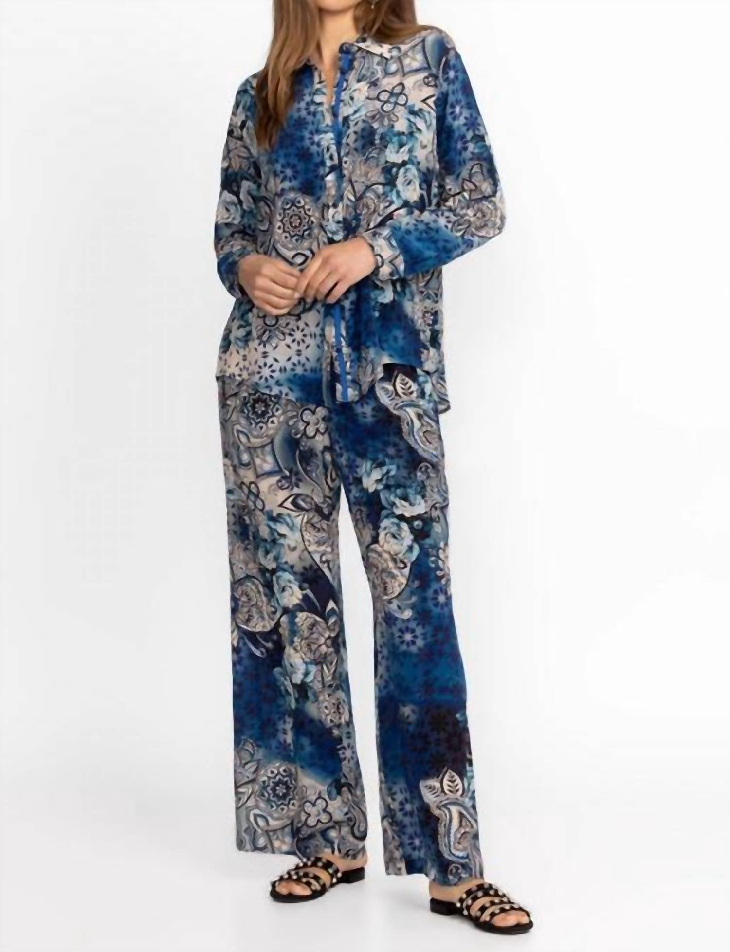Made from 100% luxurious silk, the Smocked Waist Pants are versatile and functional. They feature an elastic waist and slip pockets at the hips, offering a relaxed, wide-legged fit. The pants are adorned with a stunning, eye-catching blue pattern. The model is 5'10" and wearing a size S. Item runs large. Dry Clean