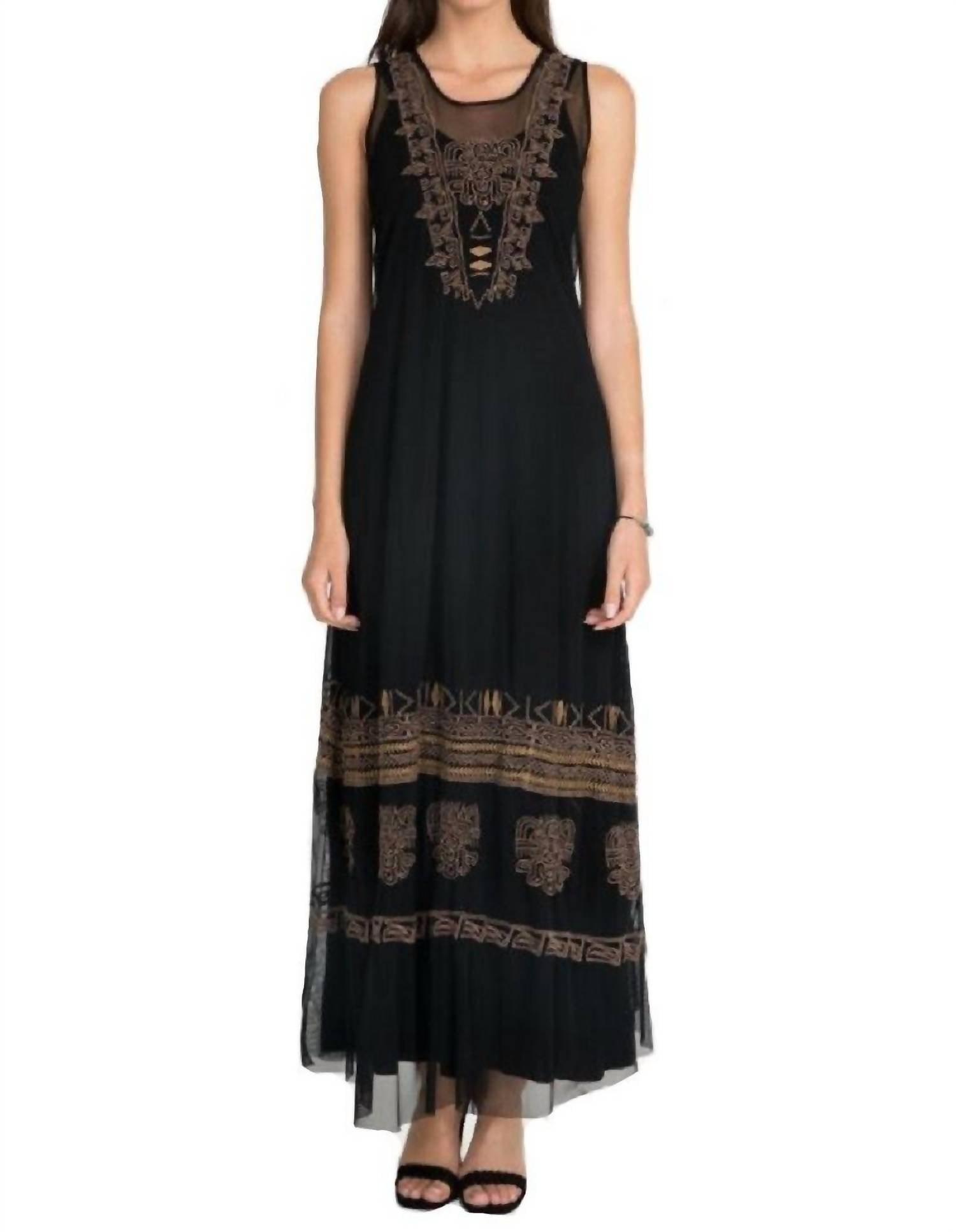 A maxi dress that is just as cute as it is comfortable. Step into effortless elegance with the Tapiwa Mesh Maxi Dress by Johnny Was, a chic and boho-inspired piece in classic black. This sleeveless dress features a slip silhouette with a scoop neckline, crafted from 100% nylon embroidered mesh. Closure: Zip closure. Care: Hand wash and line dry. Perfect for evening events, its whimsical floral embroidery and flowy, feminine fit add a summer-perfect touch to any occasion.