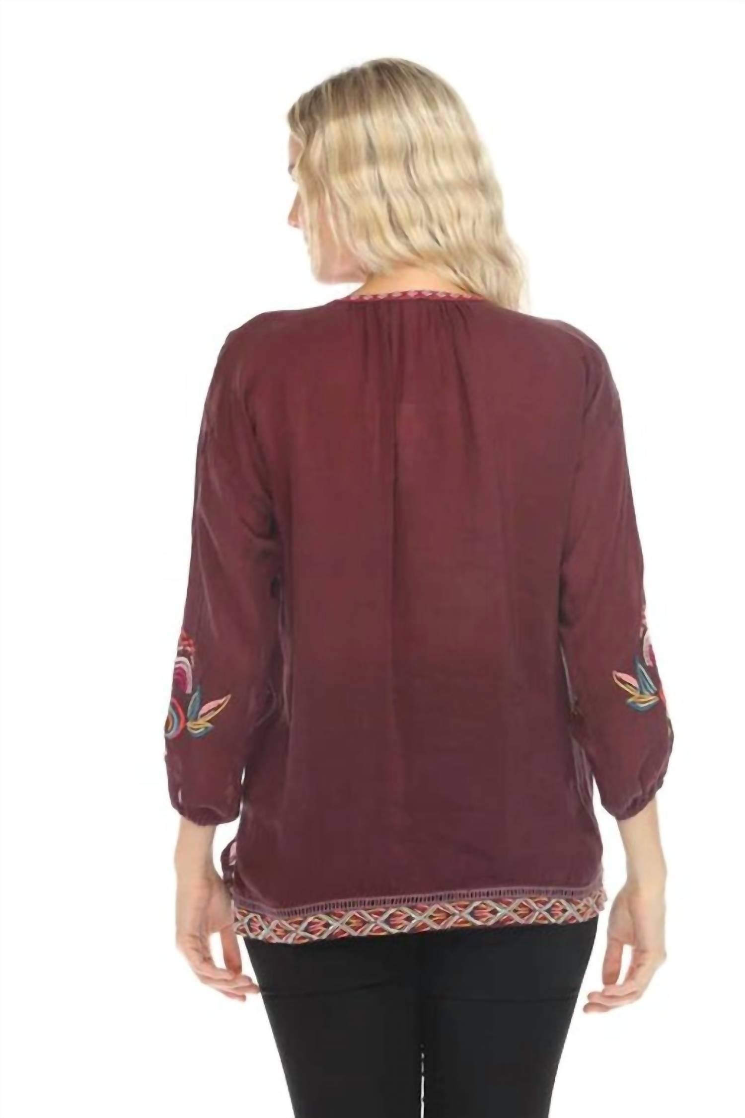 A timeless blouse that will never go out of style. The Zadonia Nemma Blouse is a trendy must-have that embodies a boho-chic style. Upgrade your wardrobe with Johnny Was pieces to showcase your best self. Made from lightweight fabric, this blouse features vibrant floral embroidery, a V-neckline with a tassel tie, 3/4 sleeves with elastic cuffs, and a hip-length hem with side slits. Hand Wash