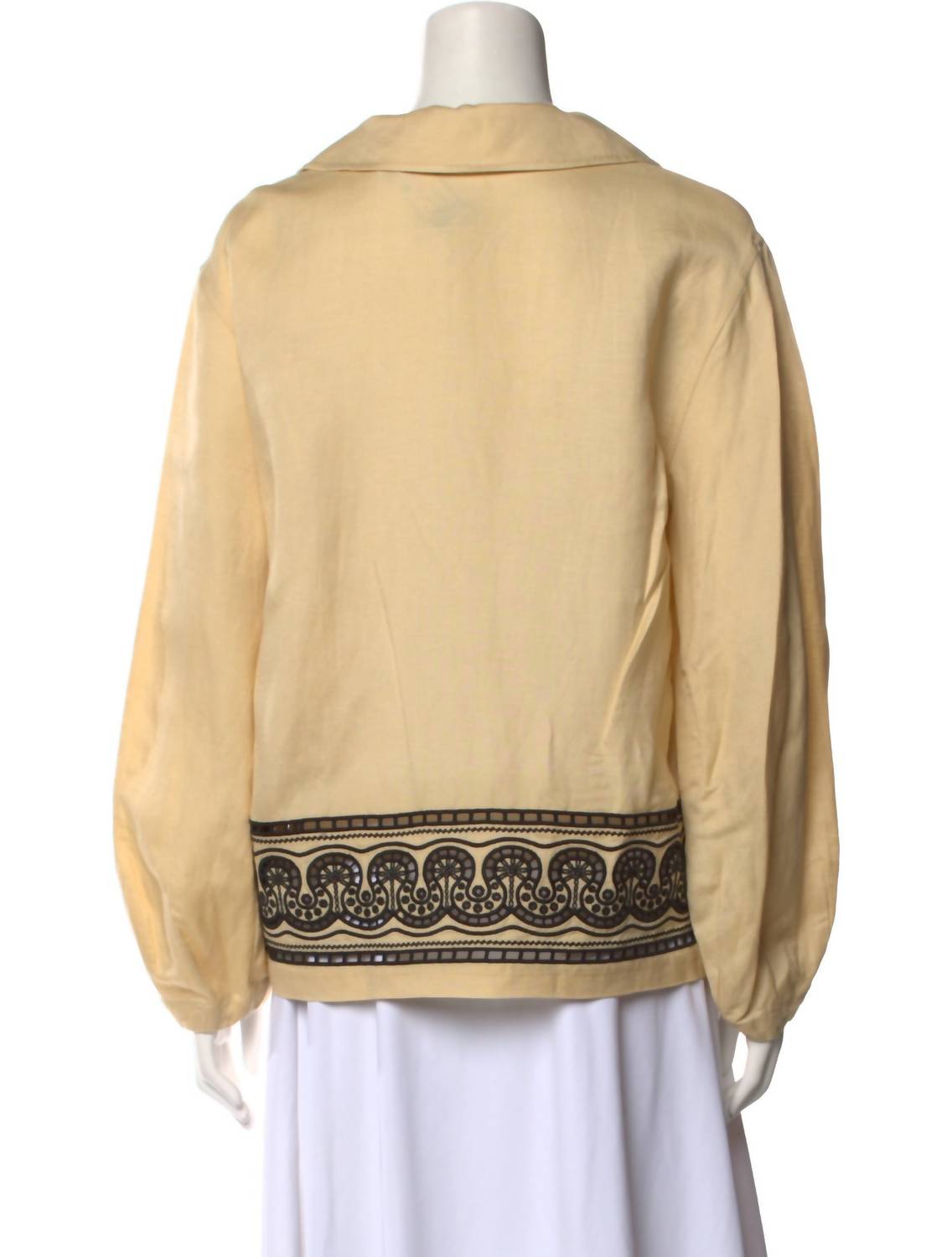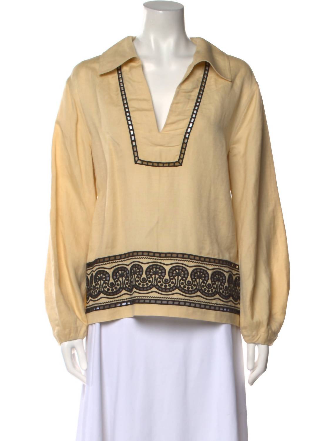 This blouse features a spread collar with a V-neckline and ties at the neckline for a versatile look. It is designed with laddering detail around the neckline and long blouson sleeves that are adorned with eyelet embroidery and additional laddering detail. Made from a blend of 55% linen and 45% viscose, this blouse requires dry cleaning.