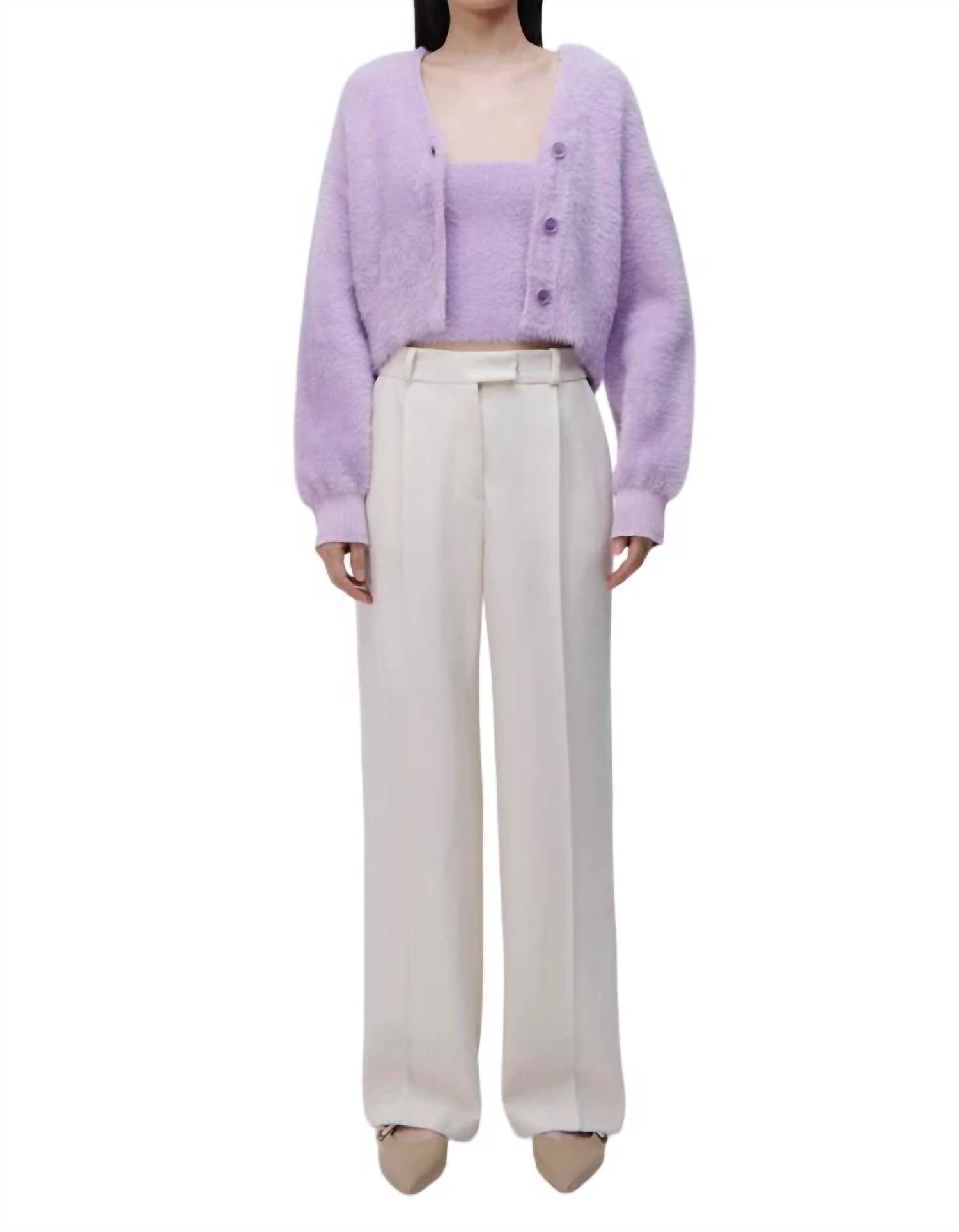 Pleated design and straight leg. Zipper fly and button closure. Materials: 55% Wool 45% Polyester. Dry Clean Only. Model is 5'10" and wearing size 2.
