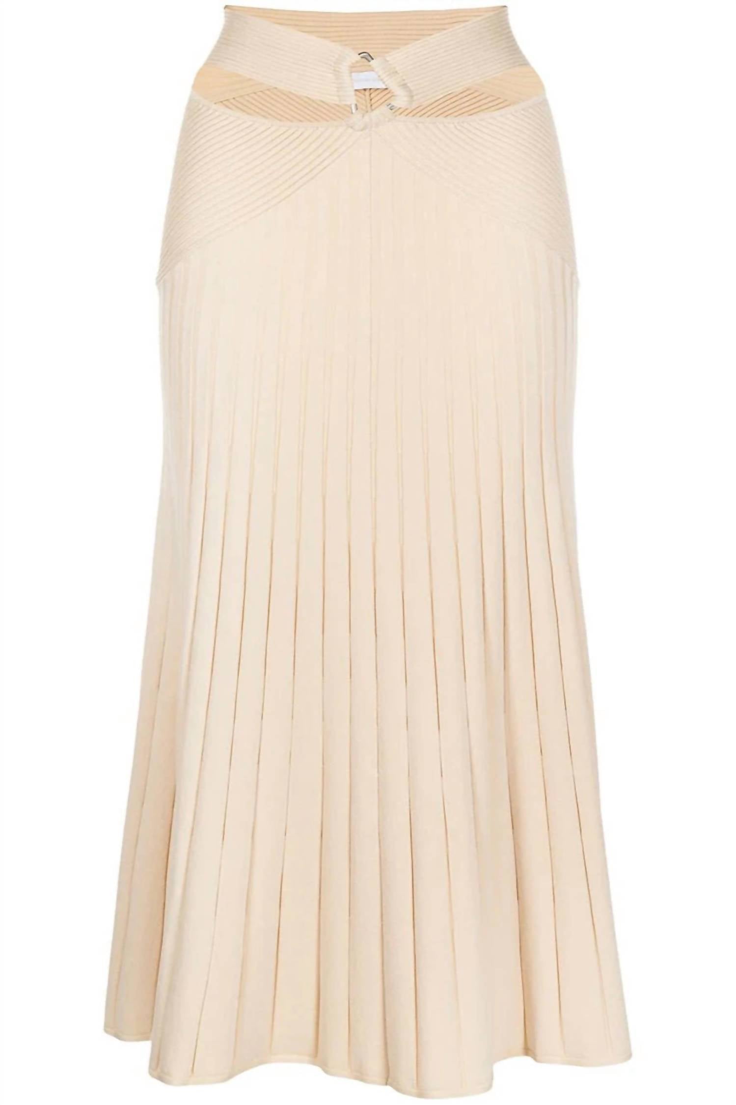 Tuck your favorite tee into this midi length skirt for an effortlessly cool look. Introducing the Arabella Rib Skirt by Jonathan Simkhai, a chic addition to your wardrobe in a sophisticated almond hue. Designed with an A-line silhouette and intricate ribbed knit cut-out detailing, this midi skirt sits at a flattering mid-rise. Composition: 62% Rayon, 25% Nylon, 3% Elastane. Closure: Pull on style. Care: Dry clean only. Perfect for spring occasions, this textured piece embodies the trend of quiet luxury.