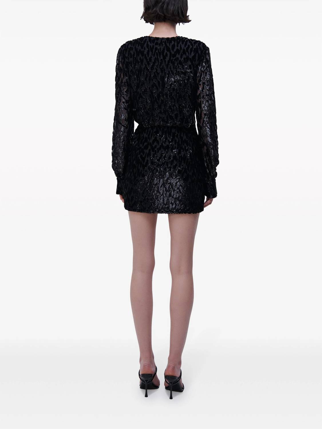 Metallic threading. Wrap design. All-over leopard print. V-neck. Front tie fastening. Long sleeves. Straight hem. Thigh-length. Materials: 60% Rayon 40% Silk. Dry clean only. True to size.