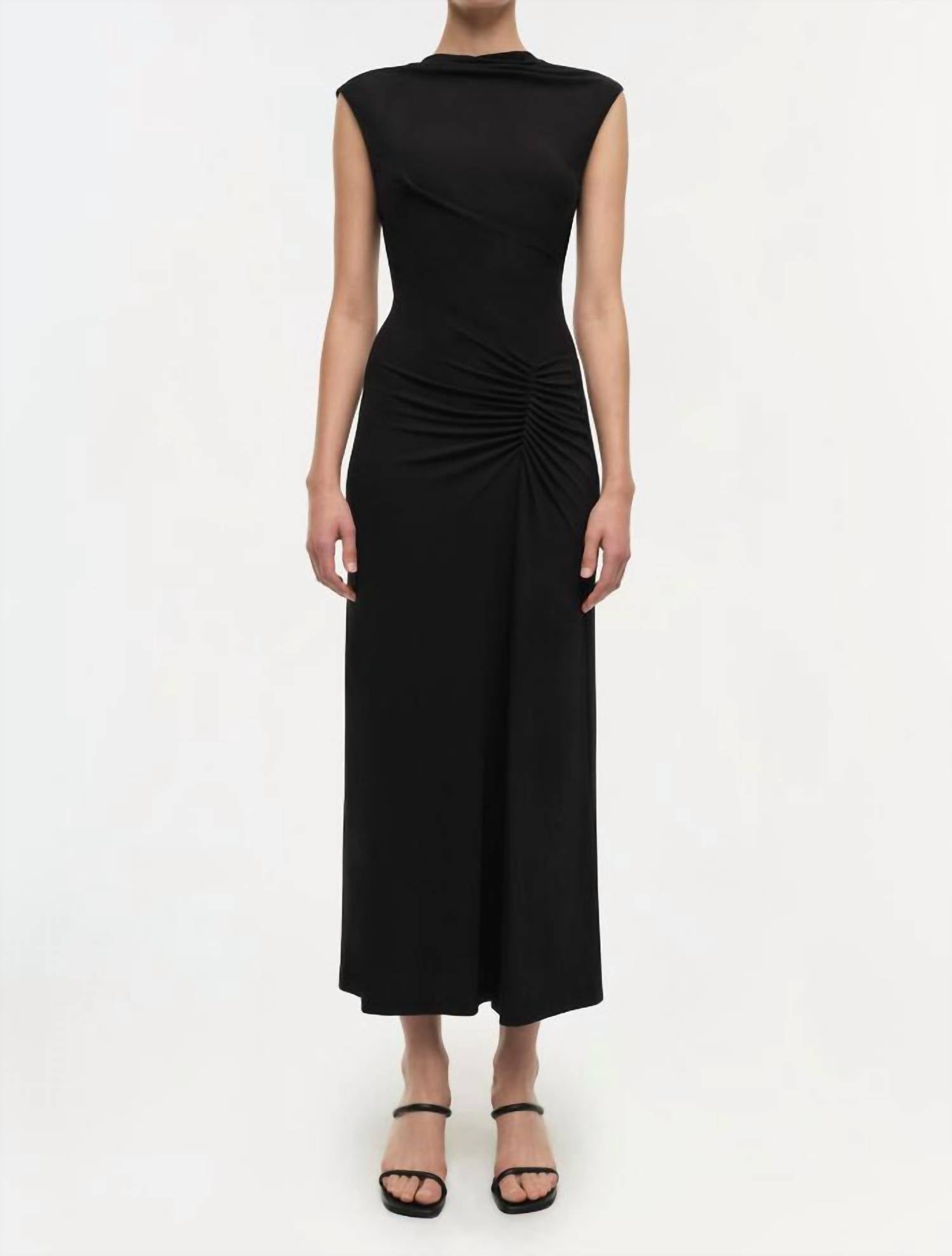 A midi dress so versatile, your options for wearing it are endless. Elevate your wardrobe with the Acacia Midi Dress by JONATHAN SIMKHAI, a perfect example of quiet luxury. This sleeveless dress boasts a sleek, solid black design with a flattering gathered waist and an A-line silhouette. The crewneck adds a timeless touch, making it suitable for a dinner party or a sophisticated New Year's Eve gathering. Effortlessly transition this chic piece from day to night for a versatile addition to your fall collection.