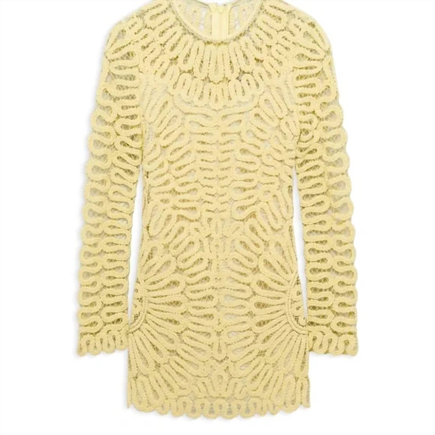 Cute and comfortable, this long sleeve dress has it all. Round neck • Long sleeves • Allover semi-sheer lace • Scalloped cuffs and hem • Back zip closure • Partially lined Color: Sulfur