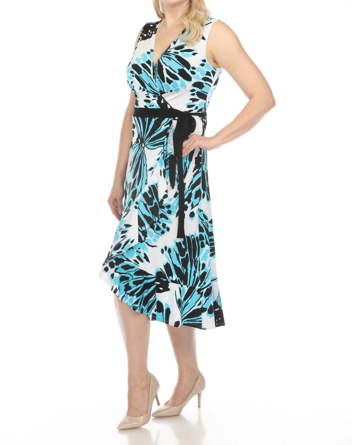 A midi dress so versatile, your options for wearing it are endless. Discover the elegance of the Joseph Ribkoff Butterfly Print Faux Wrap Midi Dress, a statement piece perfect for summer with its captivating vanilla and multi-colored design. This sleeveless dress showcases a sophisticated V-neckline and a figure-flattering A-line silhouette with a hi-low hem that falls past the knee, exuding maximalist style. Crafted from 95% polyester and 5% spandex, this pull-on dress is proudly made in Canada. Care: Hand wash in cold water with like colors and line dry in the shade; avoid tumble drying and dry cleaning.