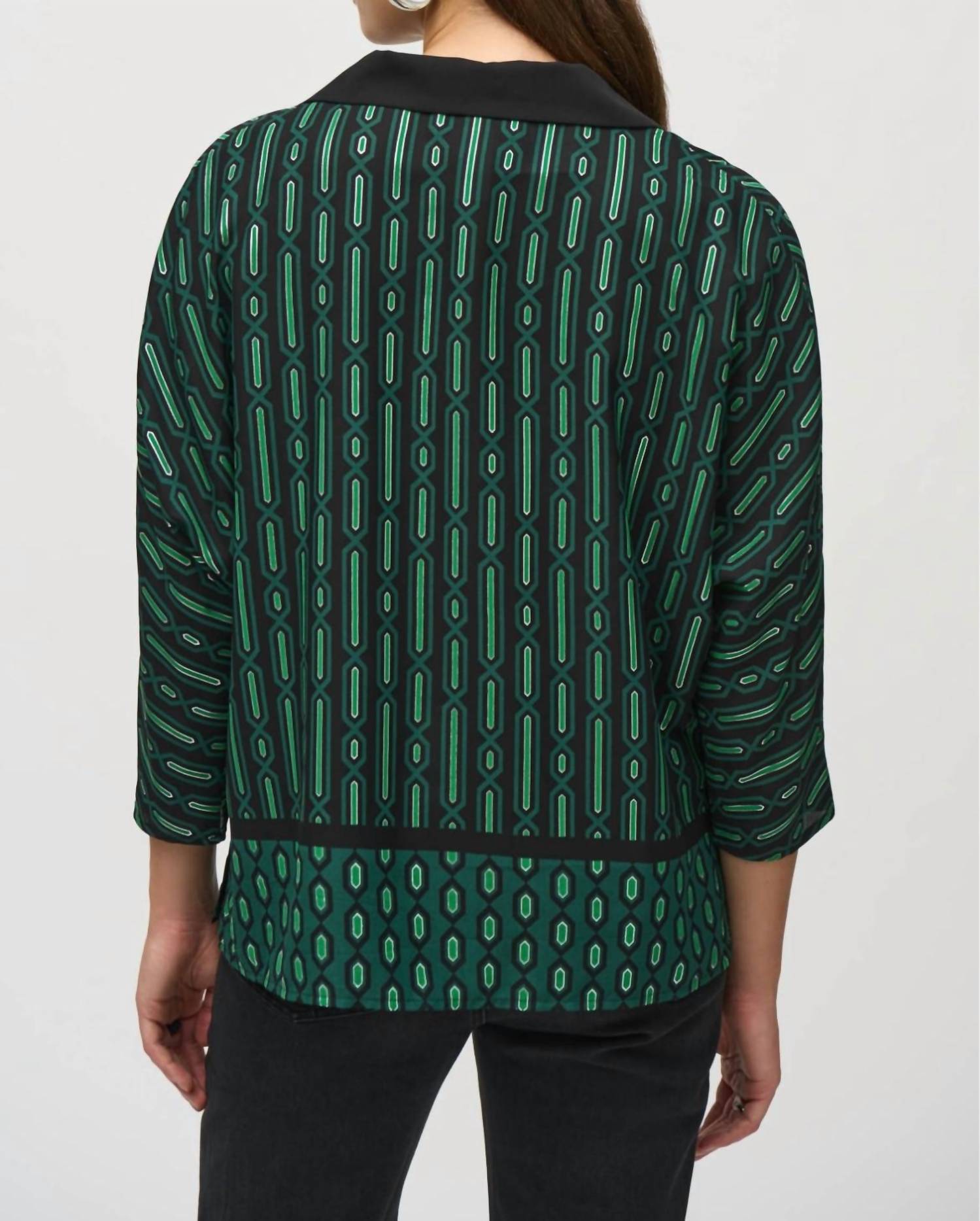 Pair this with your favorite jeans and slides for your next girls night out. Elevate your wardrobe with the Joseph Ribkoff Geometric Top in sleek Black/Multi. This stunning blouse features three-quarter dolman sleeves and a zipped mock collar, crafted from 100% polyester georgette fabric. Its bold geometric border print and sophisticated boxy silhouette make it perfect for holiday parties. Made for easy care, simply hand wash in cold water, hang to dry in the shade, and low iron if needed. Model is 5'9.5", wearing a size 6.