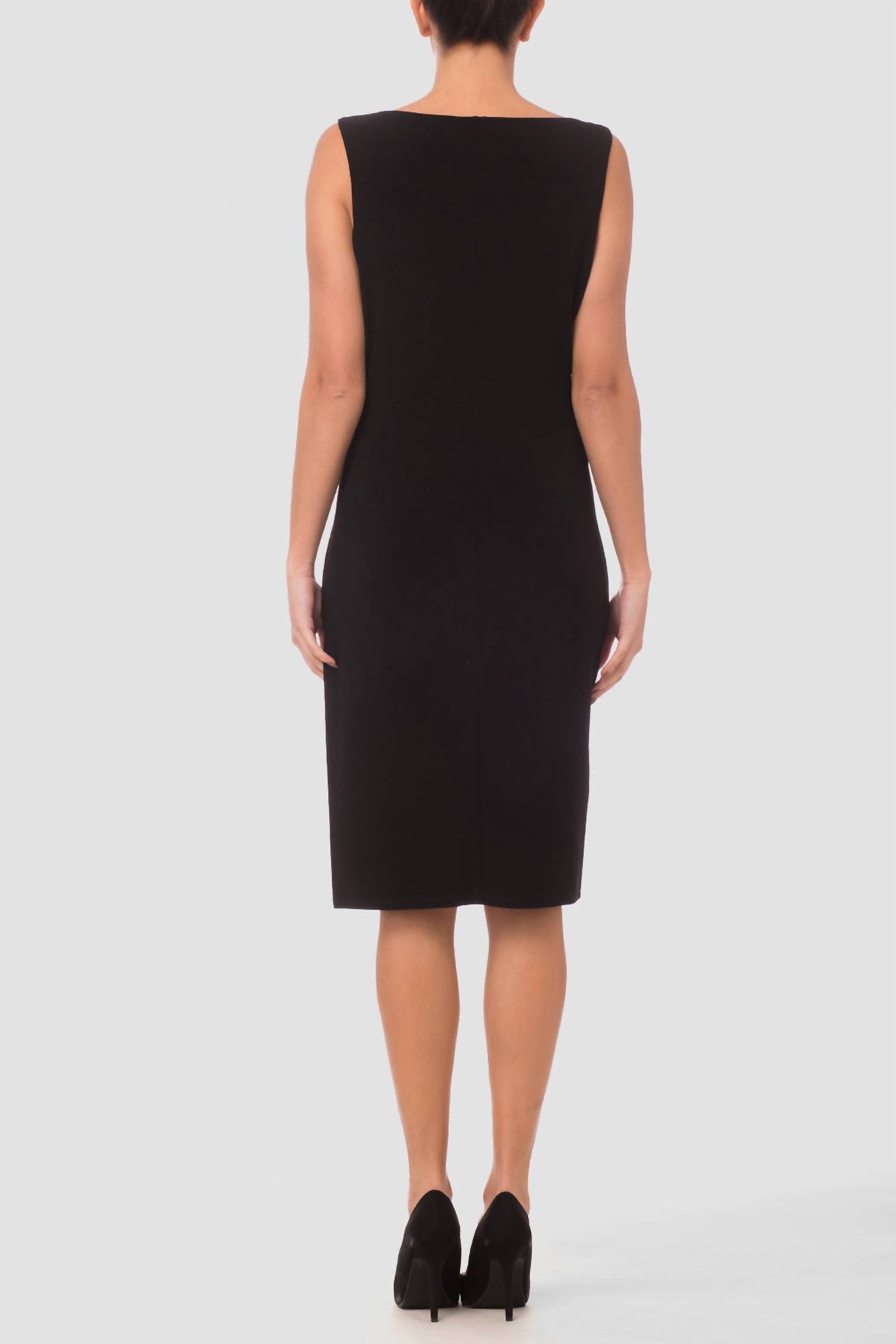 Just add slides or mules and you are good to go. The Joseph Ribkoff Sheath Midi Dress in black is a striking choice for any holiday party. Designed with a sleeveless, crewneck silhouette, it features a split skirt at both sides for a chic touch. Made from a silky knit fabric composed of 94% polyester and 6% spandex, this knee-length dress offers easy pull-on convenience and includes a discreet lining. Approximate length for size 12 is 42", and it pairs minimalist style with uncompromised comfort.