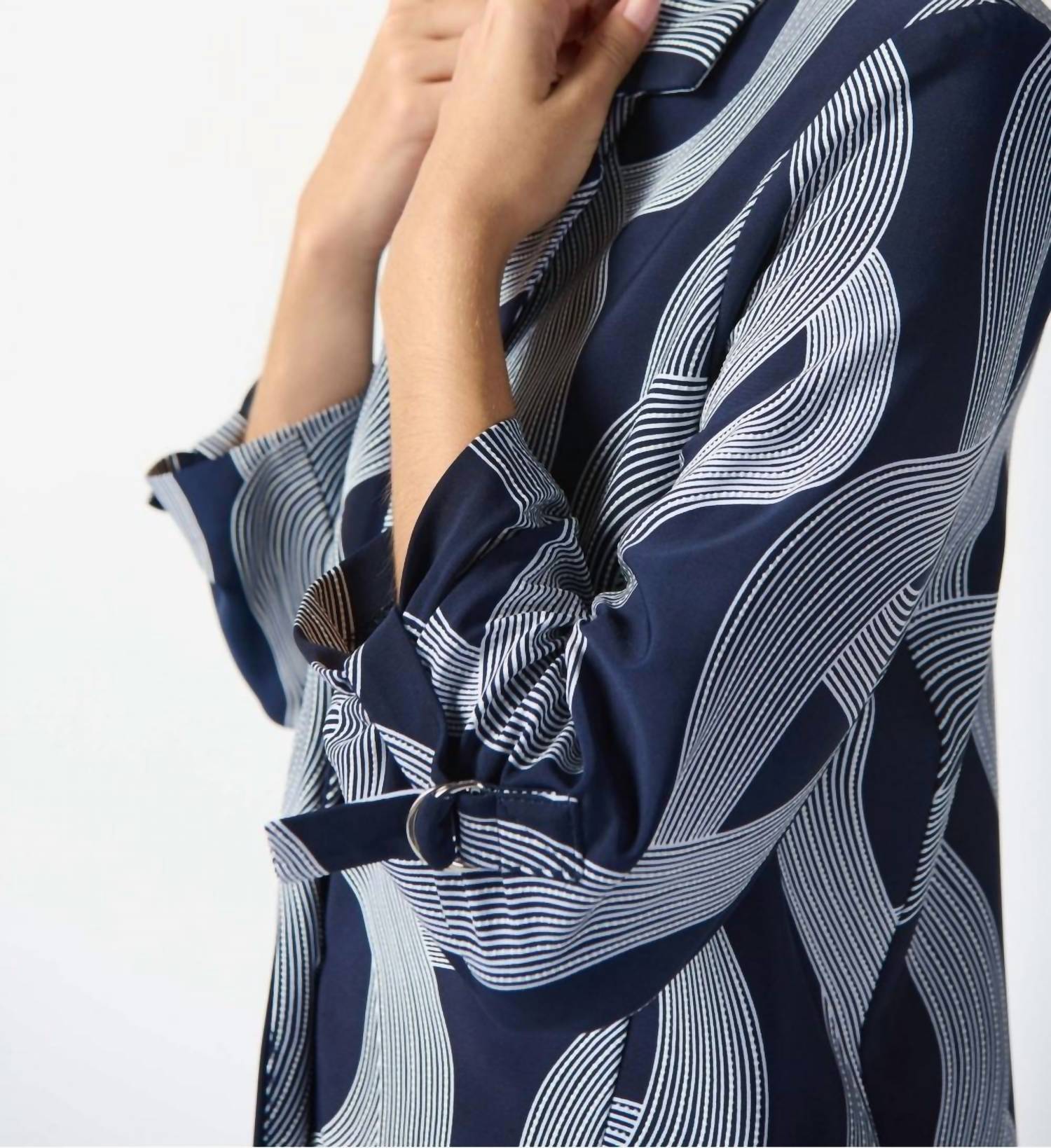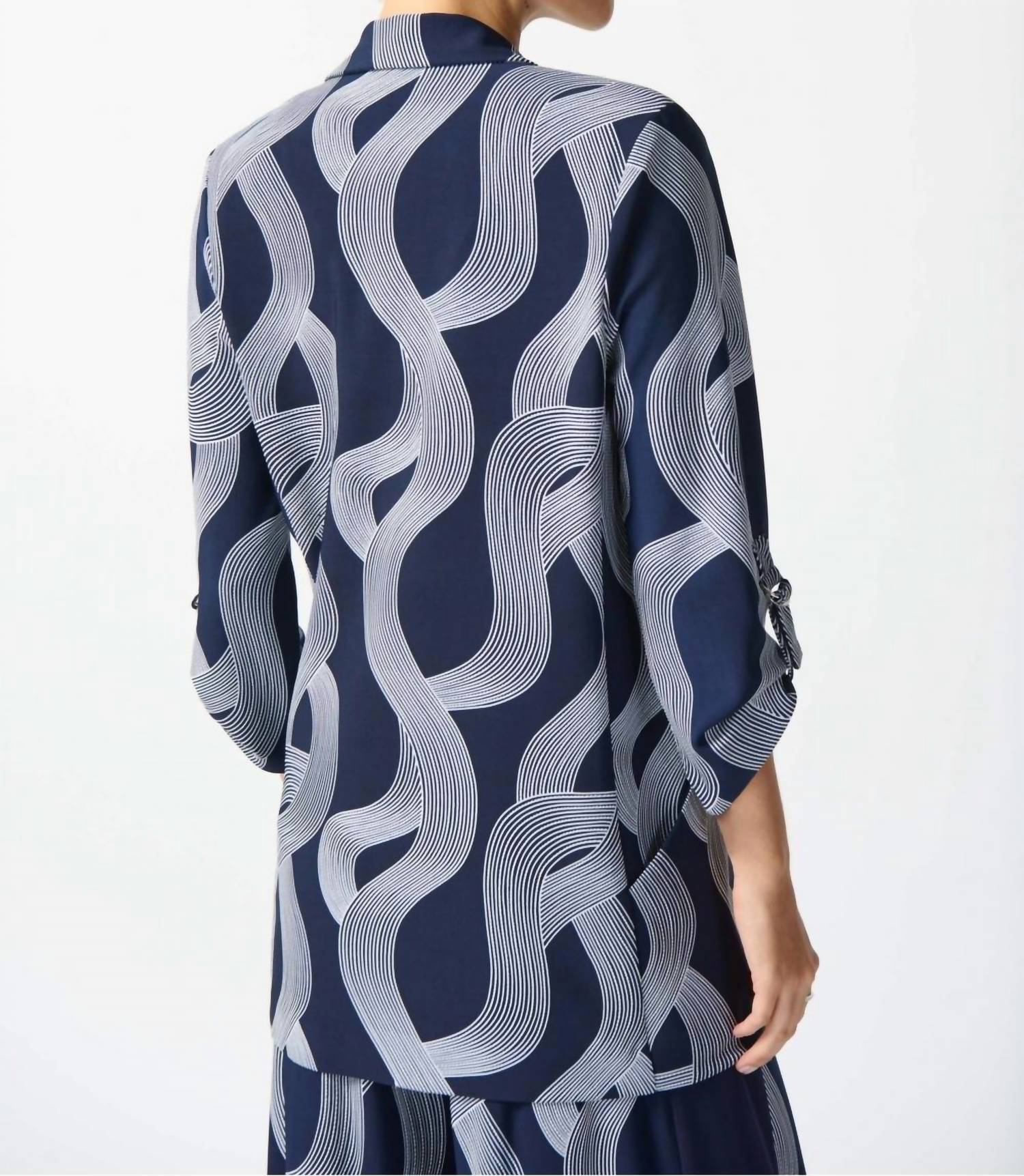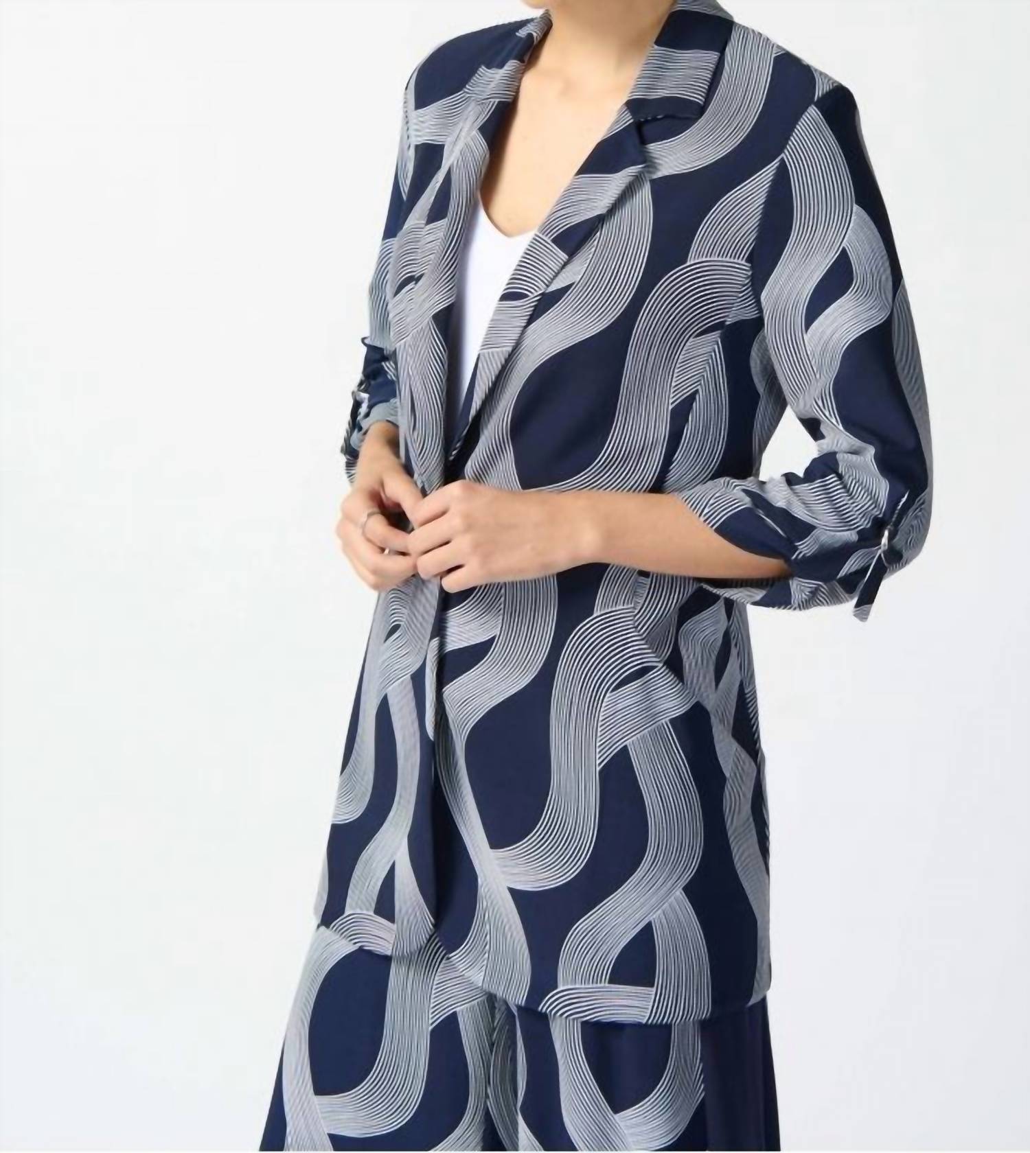 Tailored to perfection, this blazer will be your go-to jacket for years to come. Discover the Joseph Ribkoff Silky Knit Abstract Print Boxy Blazer, a statement piece for your evening event wardrobe. This blazer features three-quarter sleeves with tab and D-ring details and a notched collar that enhances its sophisticated flair. Composition: 93% Polyester, 7% Spandex. Care: Hand wash in cold colors. Perfectly captures the 90s fashion trend with its patterned design in Midnight Blue/Vanilla.