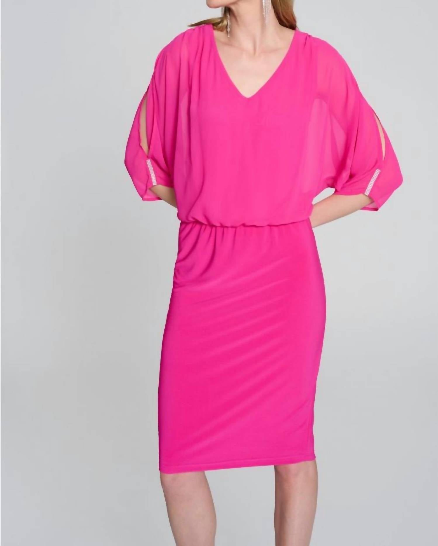 A midi dress so versatile, your options for wearing it are endless. Elevate your summer wardrobe with the Joseph Ribkoff Embellished Slit Sleeve Blouson Sheath Dress in a striking shocking pink hue. Featuring elbow sleeves with rhinestone embellishments, this dress is composed of 100% polyester and is designed with a sophisticated knee-length hem and V-neckline. Its pull-on style offers seamless elegance, while the fully lined interior ensures comfort. Care is simple: just hand wash and line dry to maintain its pristine condition, making it a perfect choice for Valentine's Day and other special occasions.