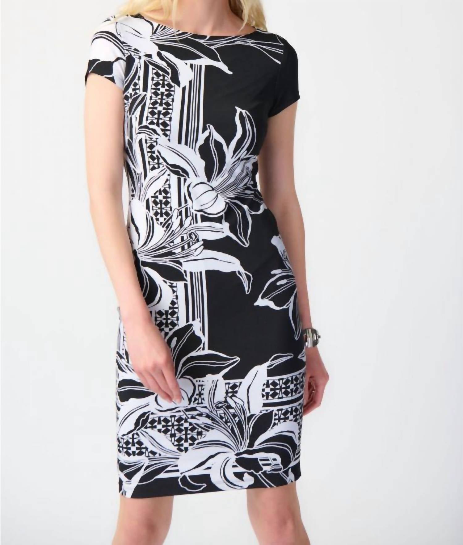 The perfect length dress does exist. Unveil your elegant side with the Floral Print Two-tone Sheath Dress by Joseph Ribkoff, expertly crafted in Canada. This sleeveless sheath dress showcases a two-tone framed floral print in black and vanilla with a sophisticated boat neckline and a convenient back zipper closure. Made from a lightweight silky knit blend of 95% polyester and 5% spandex, it promises both comfort and style. Ideal for vacations or a summer holiday, this dress is best maintained by hand washing and laying flat to dry.