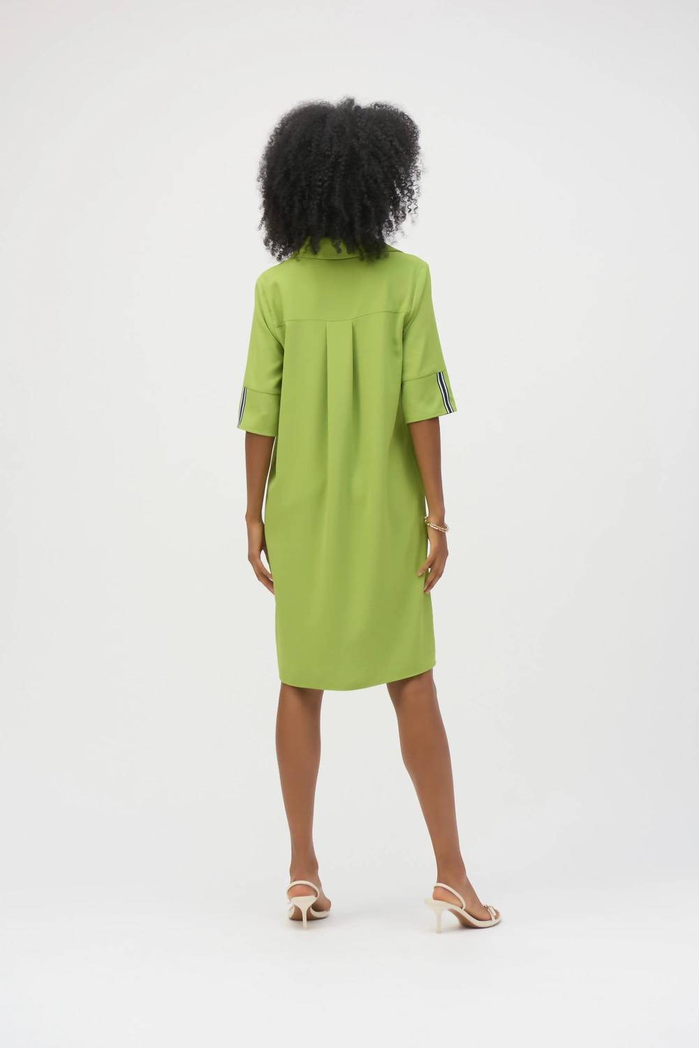 The kind of easy and flattering dress you'll be reaching for all season long. Elevate your wardrobe with the Joseph Ribkoff Half Sleeve Striped Minimalist Shirt Dress in a chic Greenery hue. This knee-length design features half sleeves and a structured collar for a polished look, enhanced by a striped button placket and matching striped trim for a touch of contrast. Crafted from lightweight, breathable 100% Polyester and made in Canada, it is perfect for summer engagements, exuding quiet luxury. The dress includes a partial button closure and requires hand washing and laying flat to dry in the shade, ensuring easy care and longevity.