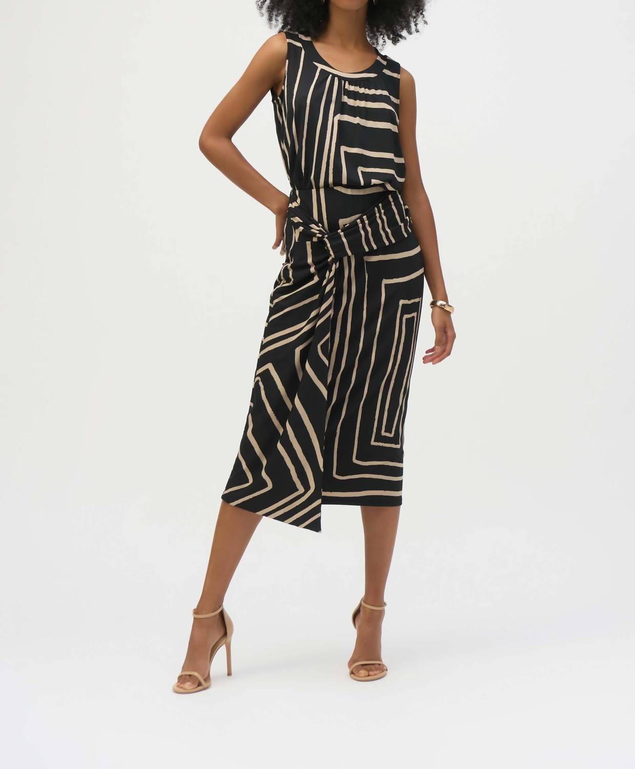 Show off just the right amount of skin in this beautifuly designed midi length skirt. Introducing the Silky Knit Geometric Print Pencil Skirt by Joseph Ribkoff, a standout piece in black and beige perfect for the modern woman. This midi skirt features a wrap design with knotted and ruched details, transitioning seamlessly from casual office wear to elegant dinner occasions. Made from 95% Polyester and 5% Spandex for a comfortable fit, it boasts an elastic waist for a flattering look. This Canadian-made skirt is a pull-on style, easy to care for with hand wash and line dry instructions.