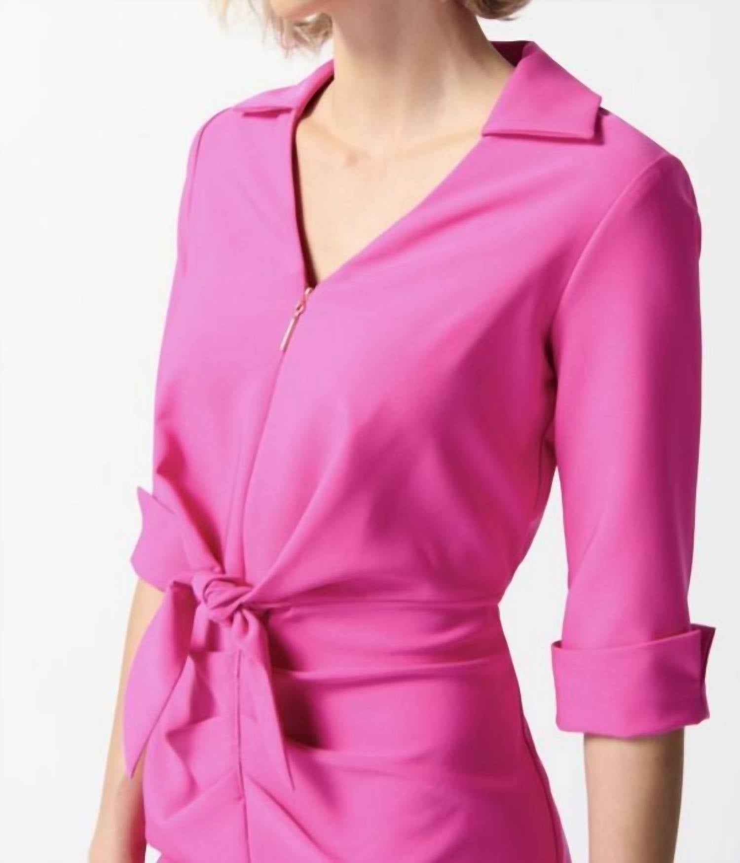 The perfect length dress does exist. Step into sophistication with the Joseph Ribkoff V-neck Collared Dress in eye-catching Ultra Pink, designed for the modern woman. Featuring three-quarter sleeves and a knee-length silhouette, this solid-patterned piece is ideal for both evening events and casual office wear. Crafted in Canada from 95% Polyester and 5% Spandex, it boasts a zip closure and is treated to resist creasing. Care instructions include hand washing in cold water and line drying, ensuring this timeless piece remains chic and elegant season after season. Model is 5'9" and wears a size 6, with an approximate dress length of 38 inches (97 cm).