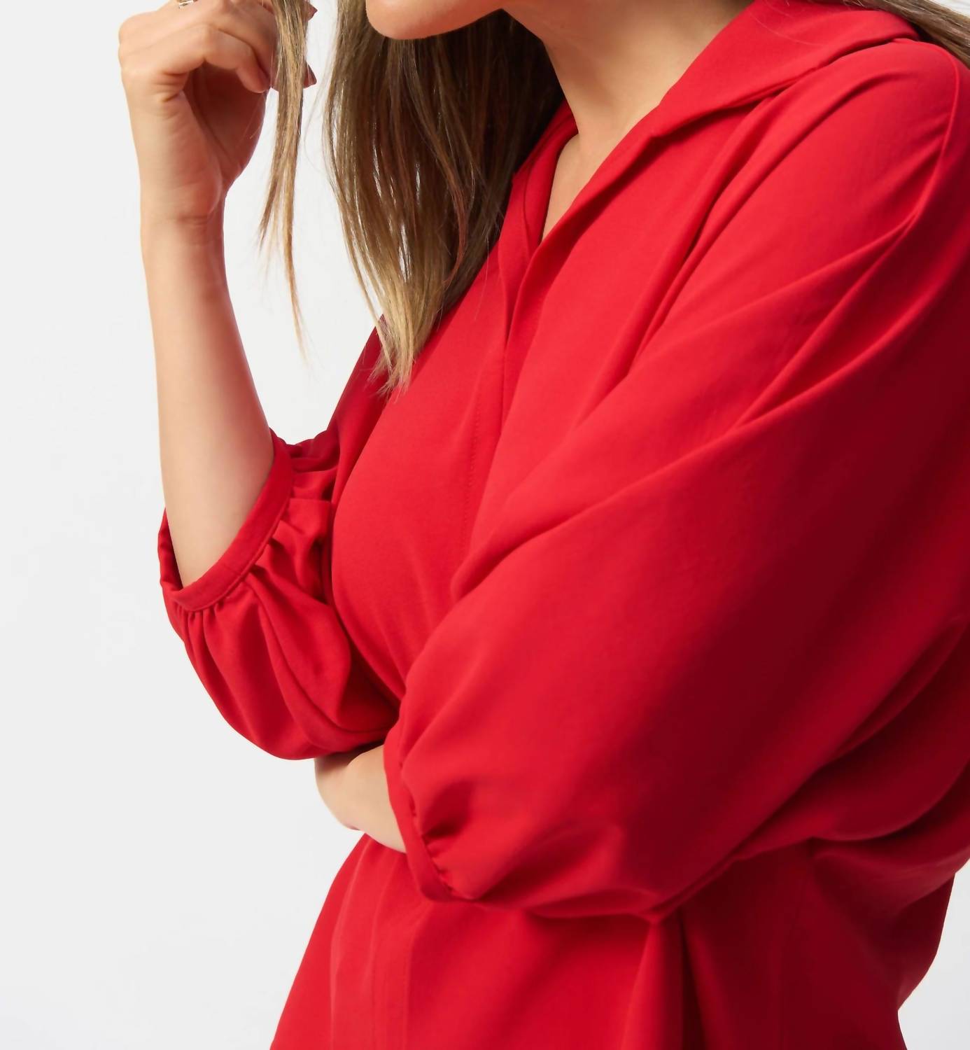 A timeless blouse that will never go out of style. Elevate your summer wardrobe with the Collared V-neck Puff Sleeve Top by Joseph Ribkoff, expertly crafted in a radiant red solid color perfect for both vacation and everyday wear. This minimalist blouse features three-quarter puff sleeves and a chic V-neckline with a collar, offering a stylish yet simple boxy silhouette. Made from 100% polyester and designed in a pullover style, it doesn't include pockets for a clean finish. Originating from Canada, this top is easy to care for—simply hand wash in cold water, line dry in the shade, and avoid ironing.