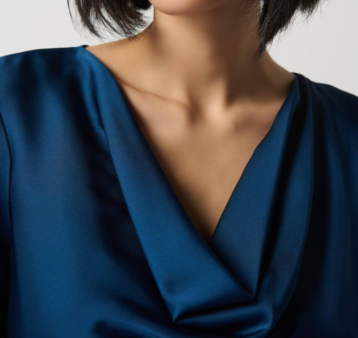 A versatile blouse that works from desk to dinner! Elevate your wardrobe with the Joseph Ribkoff Satin Blouse in a striking blue hue. This hip-length blouse features three-quarter sleeves and a chic cowl neck, designed with a pull-on closure for ease and elegance. Crafted from 100% polyester, this solid-patterned piece is perfect for a variety of occasions, offering a refined look. Care for this garment by hand washing and line drying to maintain its sophisticated silhouette.