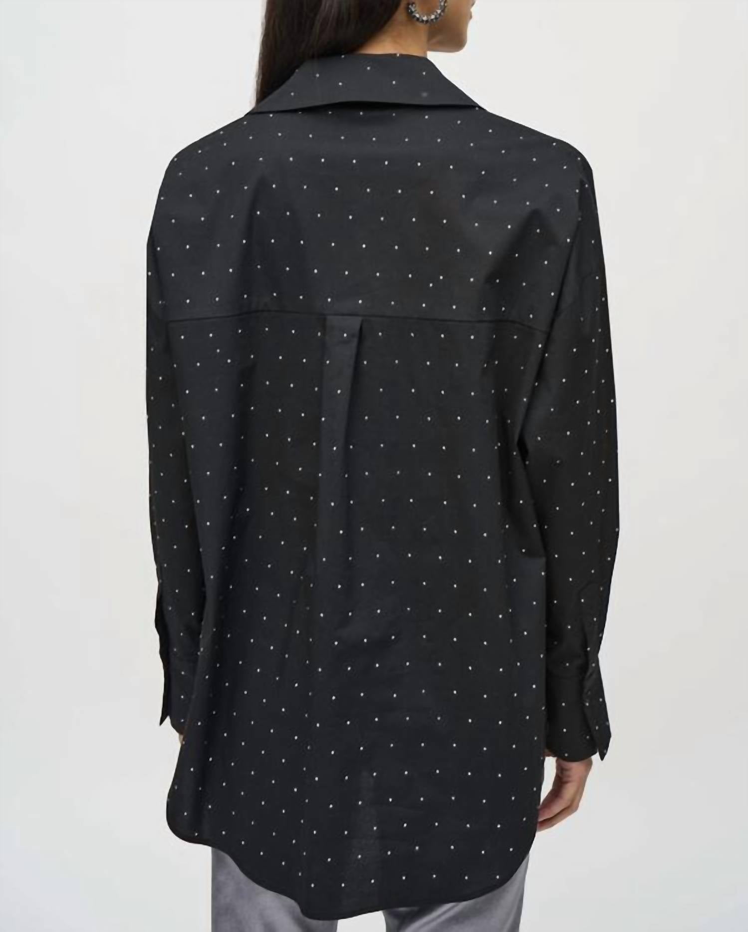 A timeless blouse that will never go out of style. Elevate your wardrobe with our chic polka dot blouse. This hip-length top features a button closure and a regular fit, making it perfect for both casual and office occasions. The classic collar and long-sleeves add a touch of elegance to this versatile piece, while the straight-sleeve design ensures comfort all day long. 95% Cotton, 5% Spandex No pockets No zipper Unlined Our model is 5'9"/175 cm and wears a size 6. Approximate length (size 12): 30" - 76 cm