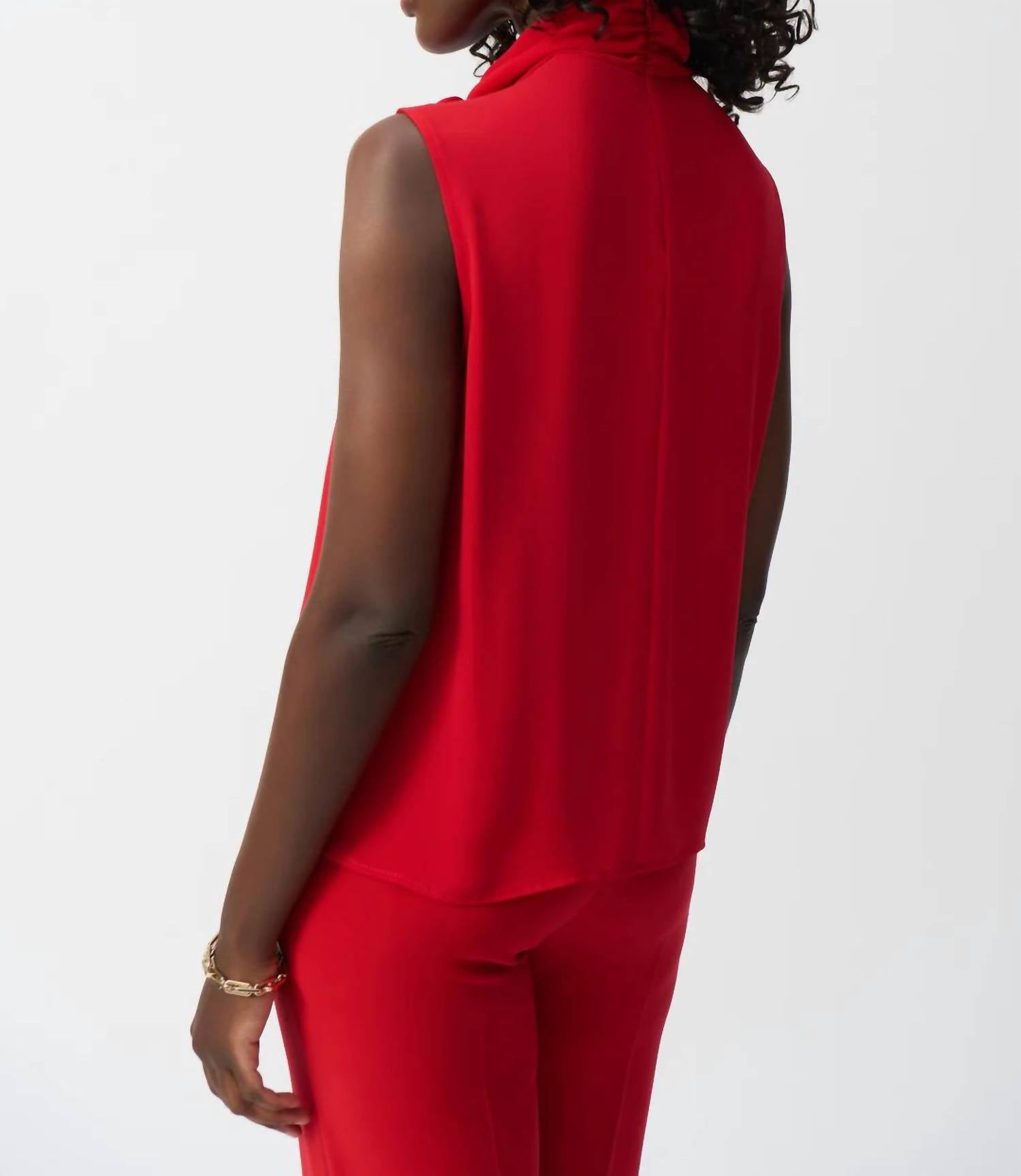The perfect tank top for those warmer weather seasons. Introducing the Joseph Ribkoff Bow Collar Sleeveless Lightweight Top, a stylish choice for staying cool this summer. Perfect for vacation, this piece features a chic bow collar and is crafted from 100% polyester, made in Canada. Designed in a radiant red solid pattern, the pull-on closure ensures easy wear and a minimalist aesthetic. Care: Hang to dry in the shade, hand wash, and low iron if needed, avoiding the trim.