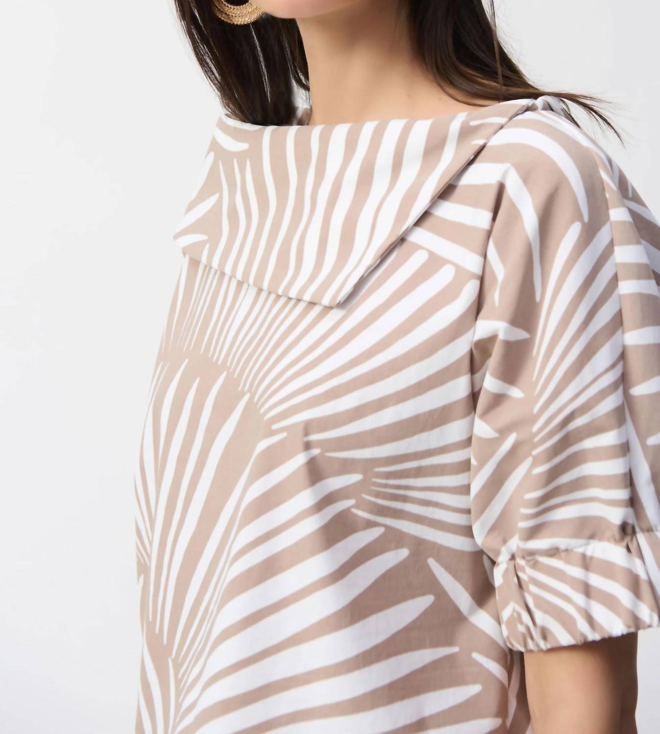A versatile blouse that works from desk to dinner! Embrace a blend of tropical charm and modern structure with the Joseph Ribkoff Tropical Print Puff Sleeve Top. This women's blouse features short puff sleeves and is crafted from a nylon blend for a breathable, comfortable fit. Made in Canada with a pull-on style, it boasts a boat neckline and an oversized fold-over collar that creates a boxy silhouette. Care for your top by hand washing it and line drying in the shade to maintain its vibrant dune and vanilla hues.