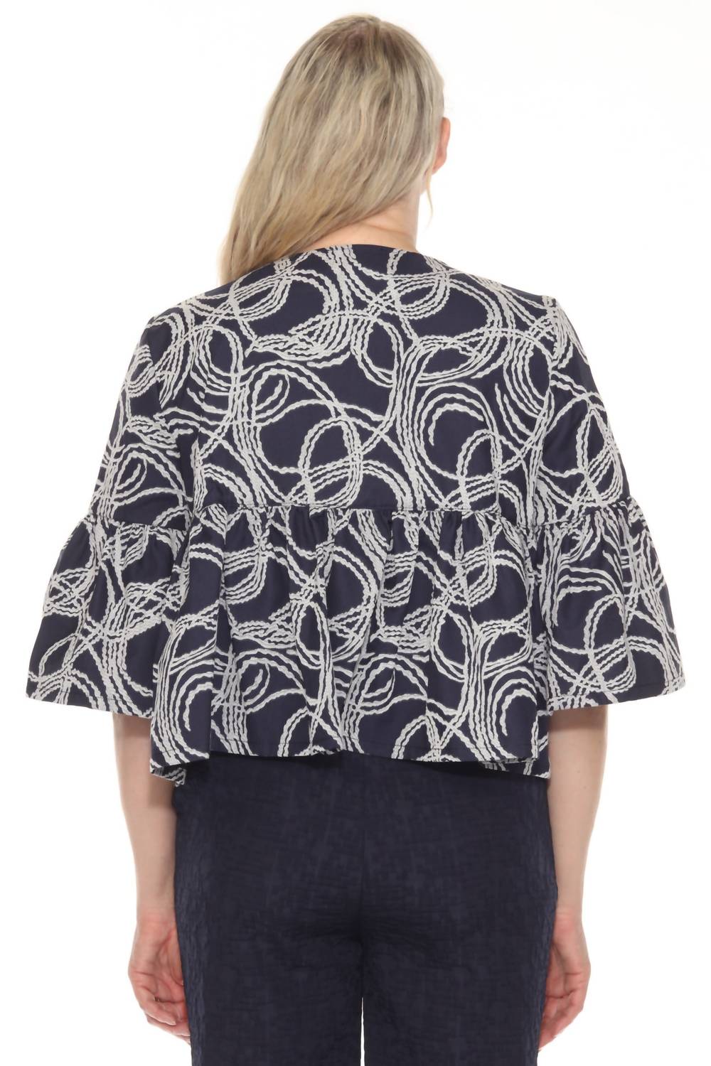A casual yet cool jacket that every closset needs. Introducing the Abstract Jacquard Zip Front Jacket by Joseph Ribkoff, an elegant choice in navy and off-white that elevates any outfit with its chic boho pattern. This stylish piece features three-quarter bell sleeves and a scoop neckline, offering a flattering trapeze silhouette that suits every figure. The jacket is composed of 61% polyester and 39% cotton, crafted in Canada, and designed for effortless closure with a two-way zipper. Care for this piece by hand washing in cold water, and line drying in the shade to maintain its pristine condition.