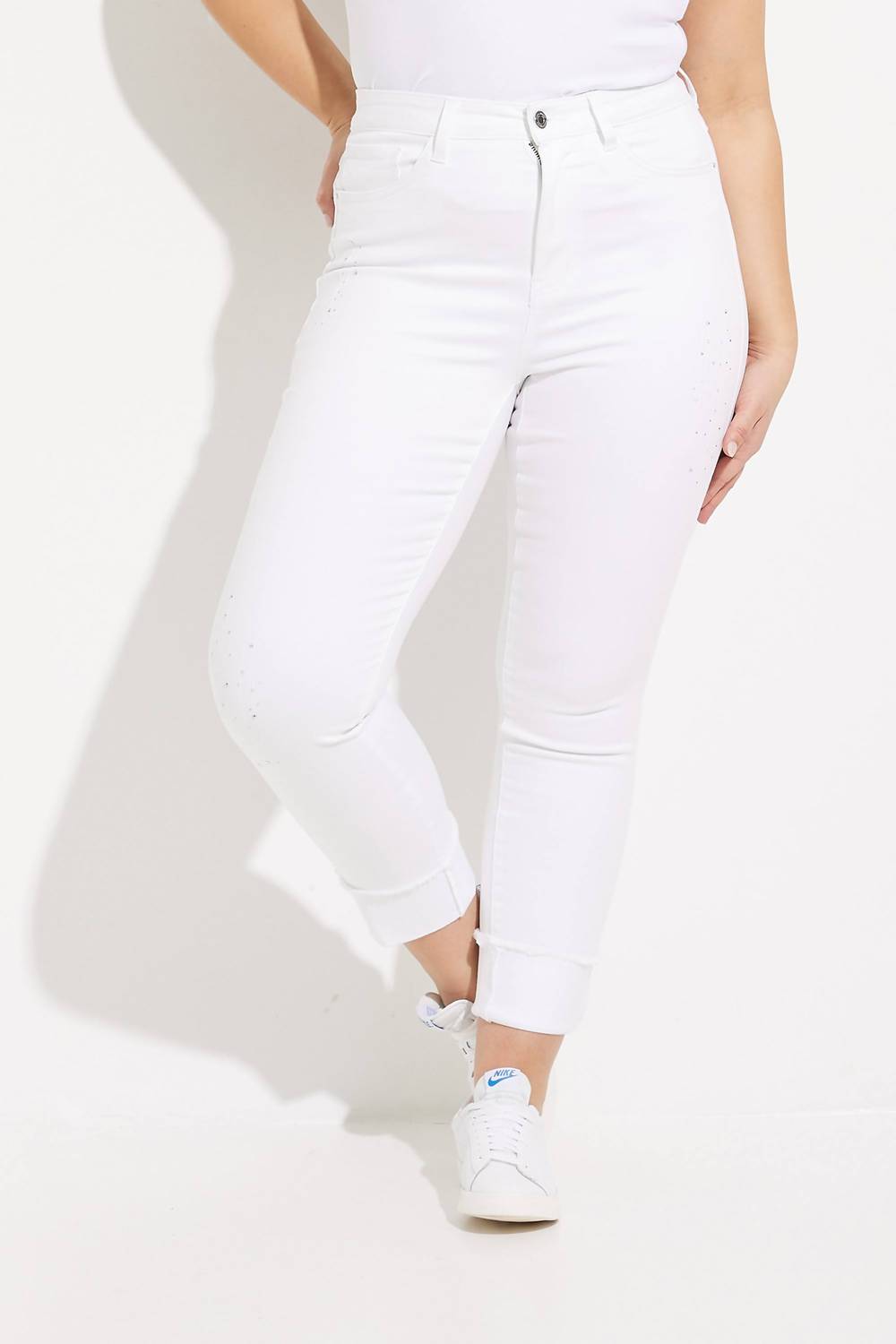 A skinny jean that is both flatering and comfortable. We love this style because it works great with boots, or without! Step into summer style with the Bling Embellished Detail Pants by Joseph Ribkoff, featuring a chic patterned design. These women's jeans boast a high-rise, skinny leg fit that hits at the ankles, offering a flattering silhouette. Crafted from a cotton blend of 70% Cotton, 27% Viscose Rayon, and 3% Spandex, they come equipped with front and back pockets and a convenient zip closure. The 30-inch inseam adds to the leg-lengthening allure, while care instructions include hand washing and line drying. Model is 5'9" and wears size 6.