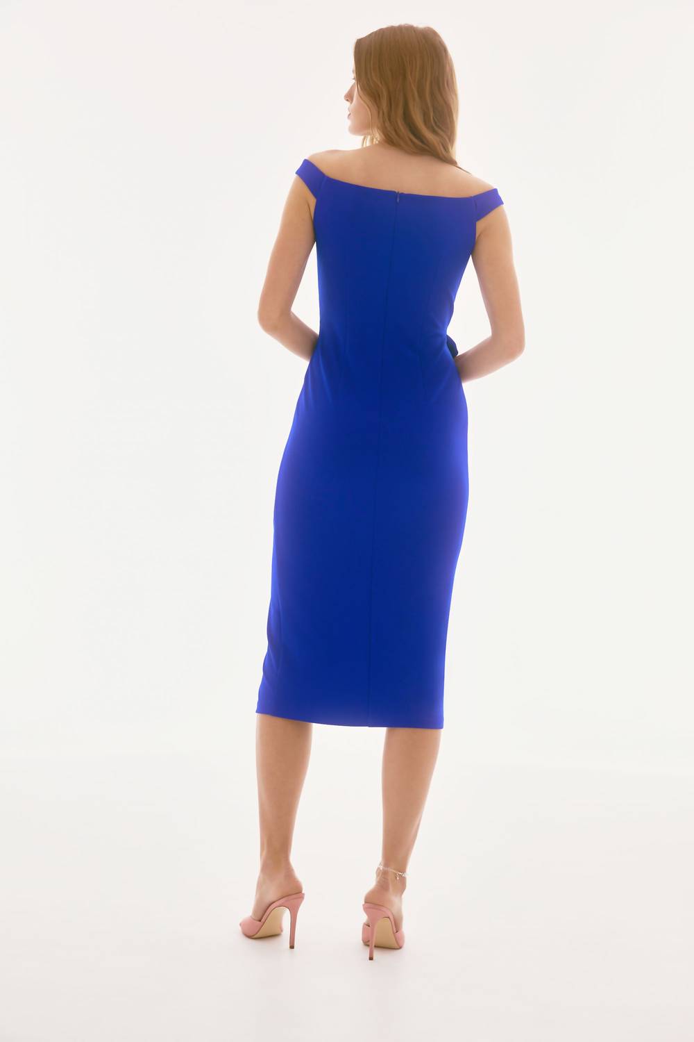 A midi dress so versatile, your options for wearing it are endless. The Joseph Ribkoff Off Shoulder Sheath Dress in Royal Sapphire offers elegant charm with a strapless design and off-the-shoulder neckline. Crafted from scuba crepe, this dress combines 95% Polyester with 5% Spandex for comfort and a flattering fit. It features a stylish slit neckline, front draping, and a waistline flower detail, finishing at a chic 42-inch midi length. Closure is ensured by a zip, and care instructions recommend hand washing and laying flat to dry.