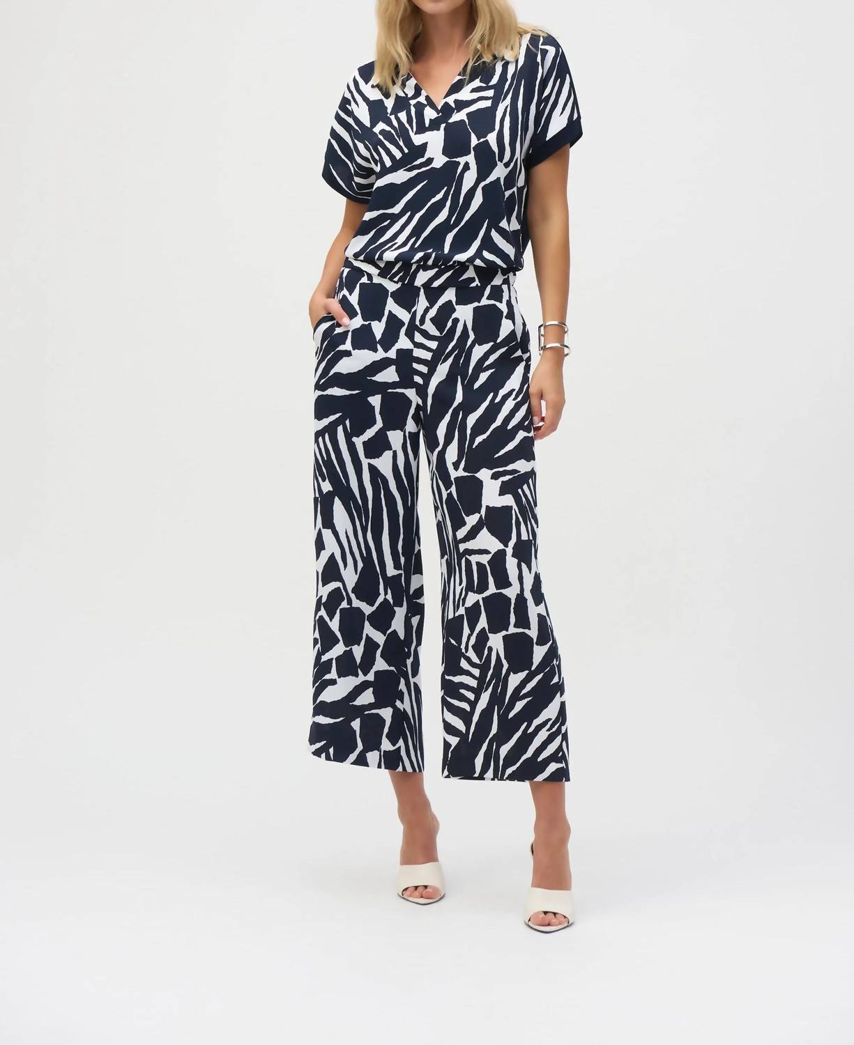 Embrace effortless style with the Joseph Ribkoff Woven Abstract Pull-On Trousers in a chic Midnight/Vanilla abstract print. These women's trousers feature a pull-on closure and relaxed fit, complete with wide legs and convenient side pockets. Crafted from 100% polyester woven fabric with shirring at the back waistband for all-day comfort. Care for these patterned pants by hand washing in cold water with like colors and laying flat to dry, avoiding bleach and ironing.