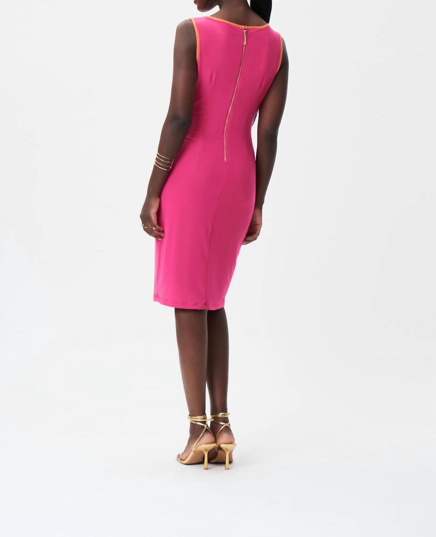 The kind of easy and flattering dress you'll be reaching for all season long. Elevate your wardrobe with the Sleeveless Dress With Belt by Joseph Ribkoff, a stylish choice in a vibrant pink/mandarin hue. This mini sheath dress is crafted from 96% polyester and 4% spandex, offering a flattering fit and elegant silhouette. Fasten it with a convenient zip closure to maintain its sleek look. For optimal care, gently hand wash and lay flat to dry.