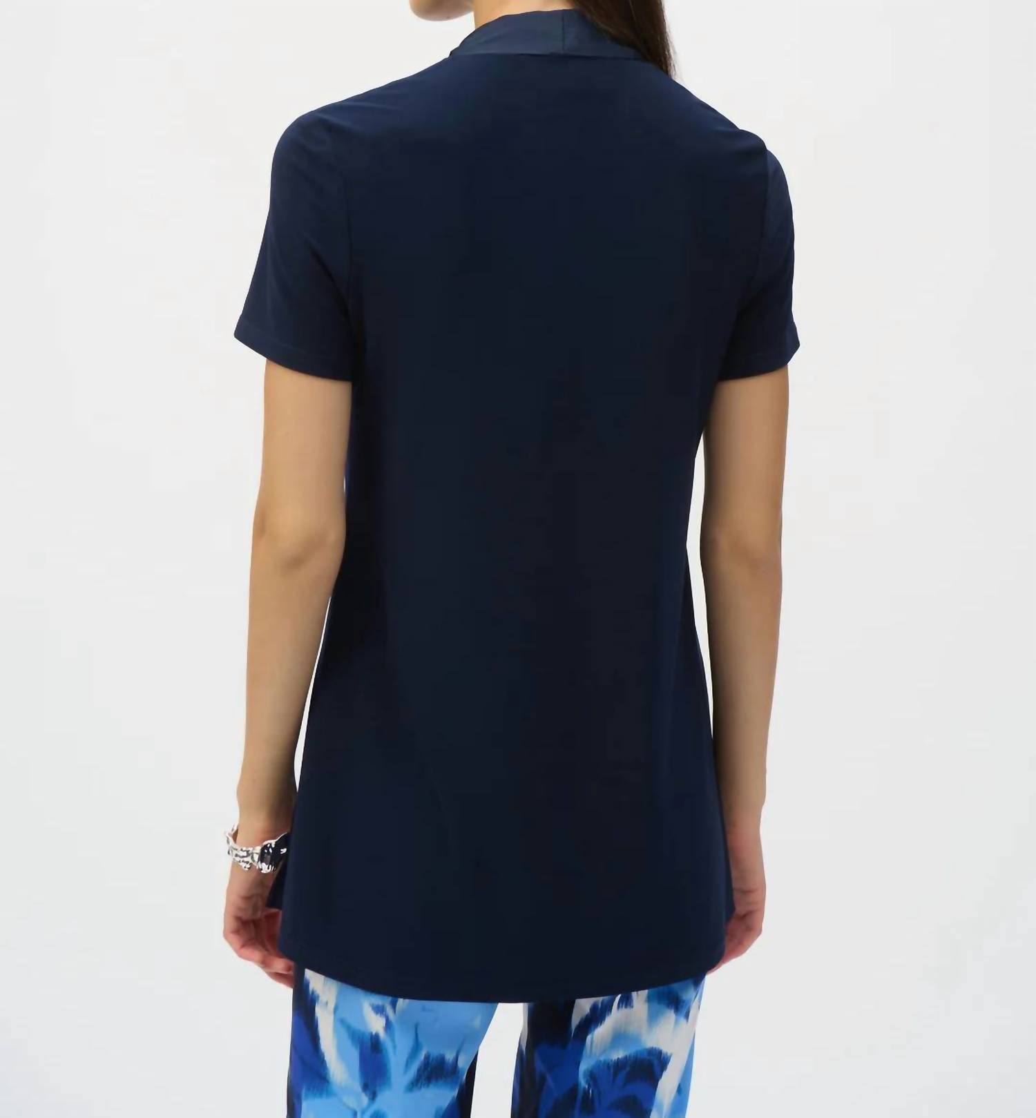 The short sleeve tee you'll want in every color. Enhance your summer wardrobe with the Satin Scarf Short Sleeve Top by Joseph Ribkoff in an elegant Midnight Blue hue. This minimalist piece features chic short sleeves and a sophisticated V-neckline, crafted from 96% Polyester and 4% Spandex for a comfortable fit. Made in Canada, the top showcases a unique satin scarf detail threaded through eyelets for added allure, with side slits for movement—ideal for vacation and day-to-night wear. Care is simple with a tie closure; hand wash in cold water and lay flat to dry.
