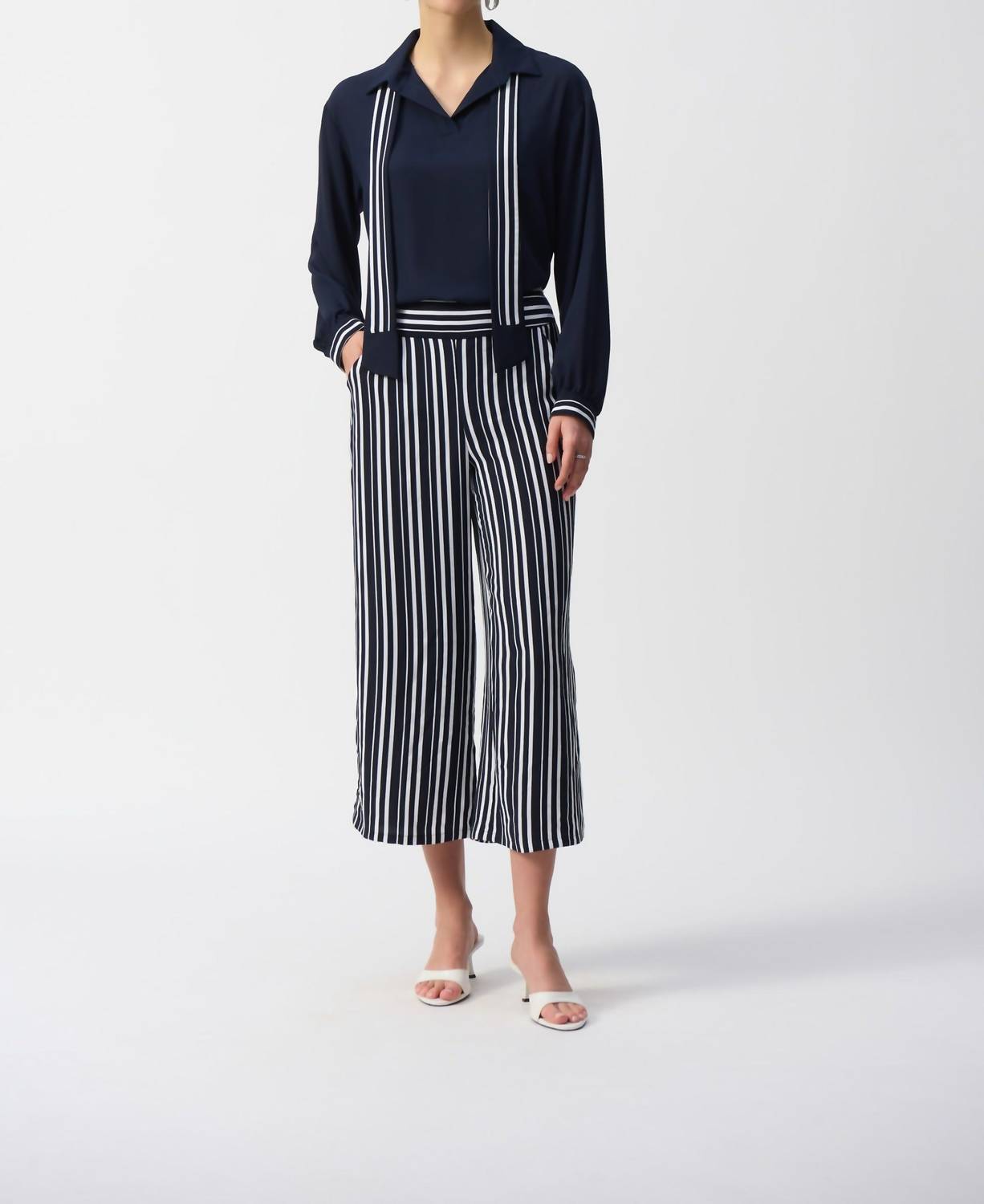 Cozy fabric, impeccable design - Meet the sweatshirt that you'll never want to take off. Elevate your wardrobe with the Joseph Ribkoff Striped Scarf Pullover, artfully designed in Midnight Blue/Vanilla for a chic look. Featuring long puff sleeves with stripe woven cuffs and a sleek open shirttail collar, this pullover is crafted from 100% polyester. The attached woven stripe scarf at the neckline adds a unique flair, effortlessly completing this sophisticated piece. Designed with a pull-on closure, it requires hand washing and laying flat to dry for optimal care.