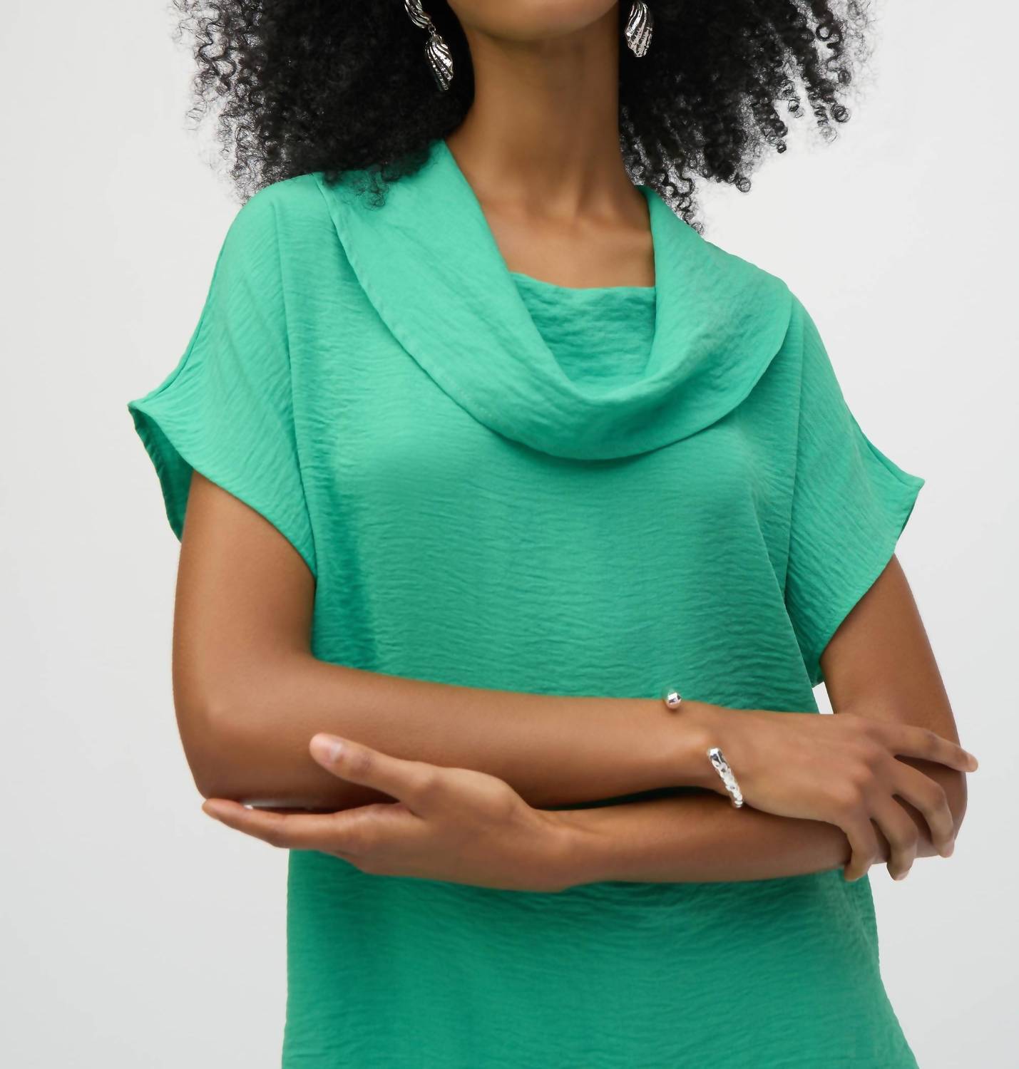 Pair this with your favorite jeans and slides for your next girls night out. Elevate your wardrobe with the Joseph Ribkoff Cowl Neck Short Sleeve Gauze Top in Garden Green, designed for a chic, minimalist look. This women's blouse features short dolman sleeves and a cowl neckline, all crafted from 100% polyester in a textured pattern. With its pull-on style, the top is made in Canada and is ideal for spring, whether layered or worn alone. Care instructions include hand washing in cold water, laying flat to dry in the shade, and avoiding ironing or dry cleaning.