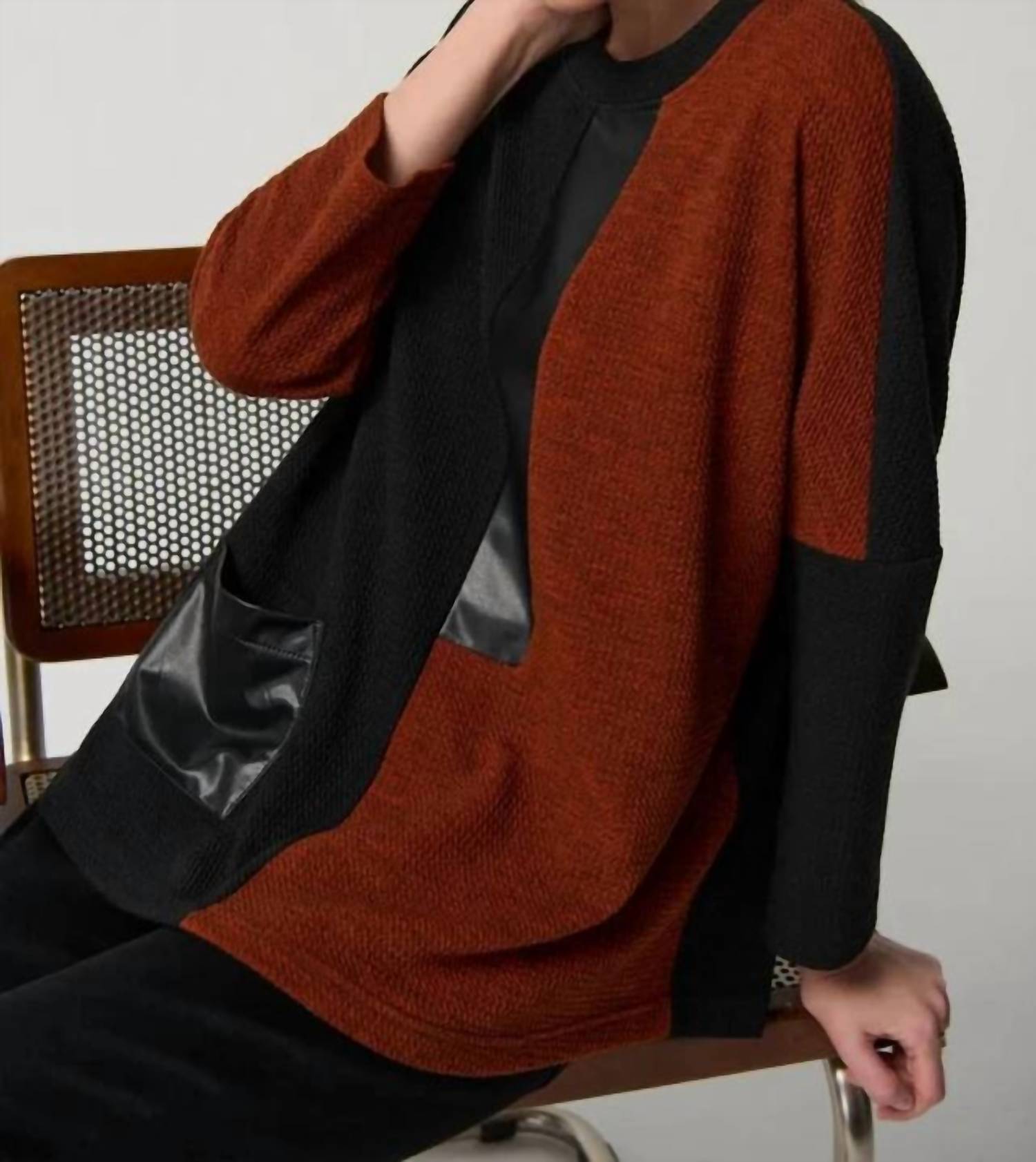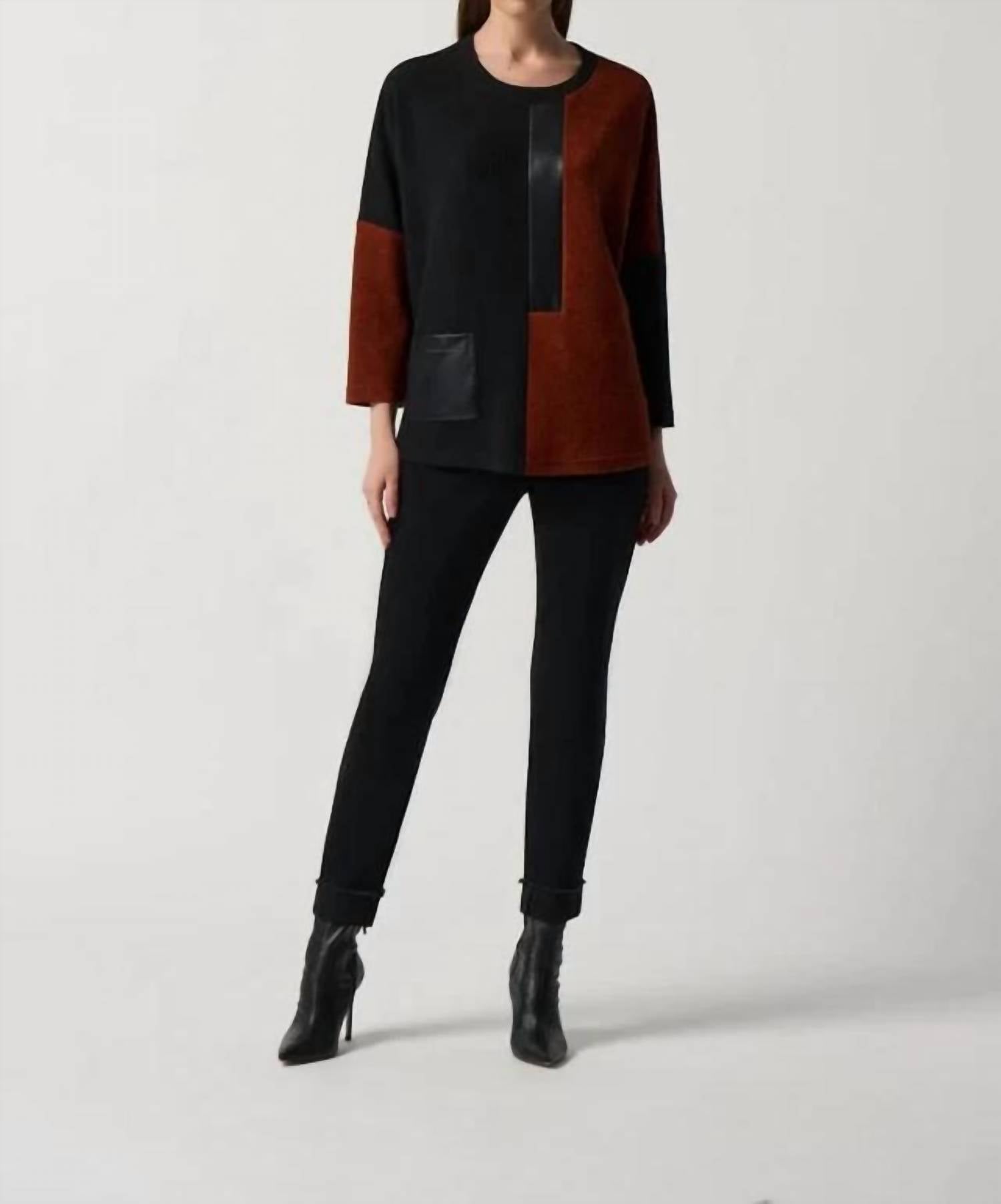 Experience the perfect blend of comfort and style with this trendy crew neck sweater, designed to effortlessly elevate your wardrobe. Pair it with your favorite denim and loafers for the perfect look. Elevate your style with the Joseph Ribkoff Boxy Colorblock Sweater Top in striking black/tandoori hues. This sophisticated piece features long sleeves and is composed of 81% Polyester, 15% Viscose Rayonne, and 4% Spandex, offering both comfort and elegance. With an approximate length of 26" (66 cm) for size 12, it boasts a faux leather panel detailing on the front, contouring the neckline and pocket. Closure is seamlessly managed with a pull-on design, while care is simple with hand wash and line dry instructions. Model is 5'9"/175 cm and wears a size 6.