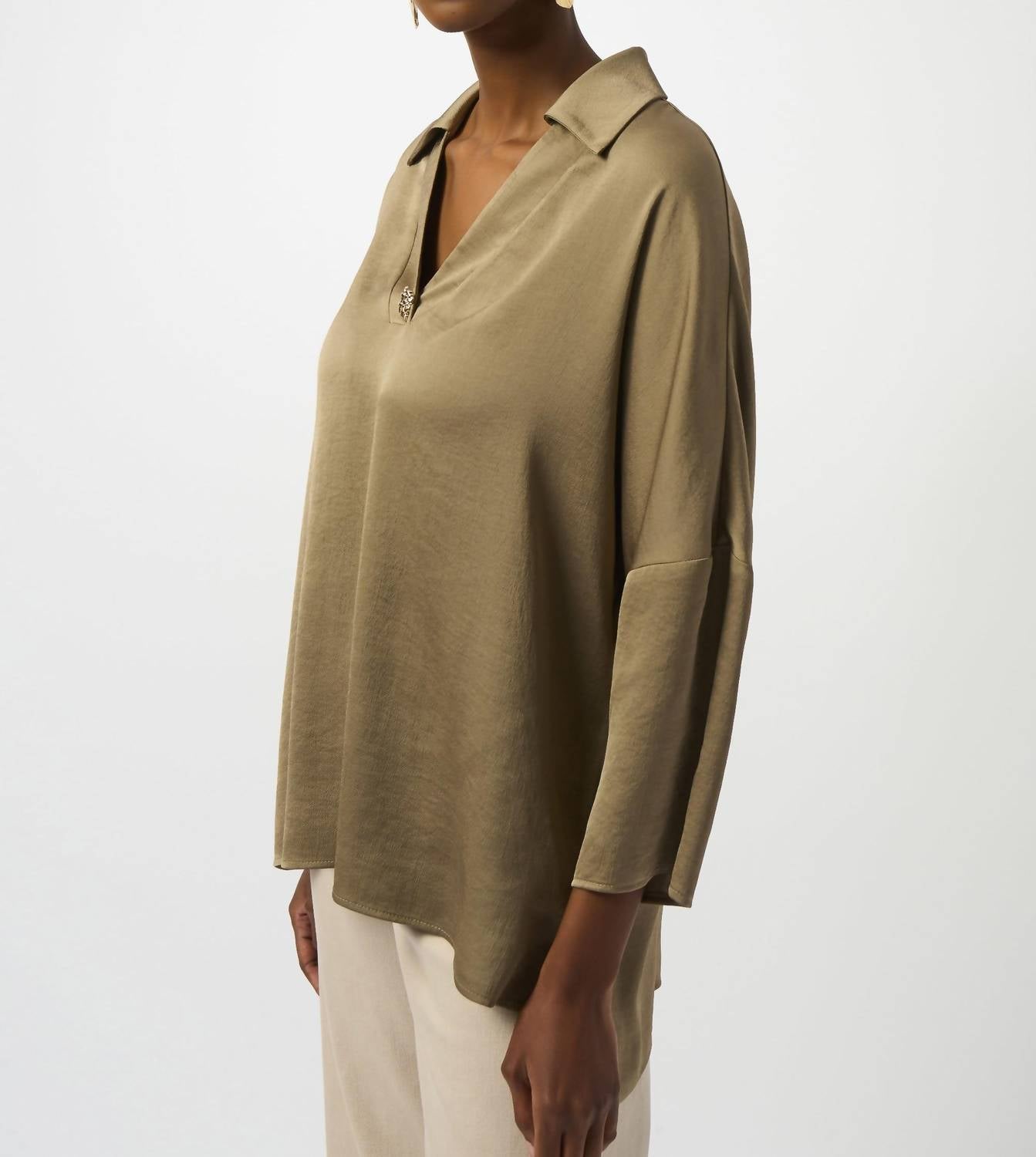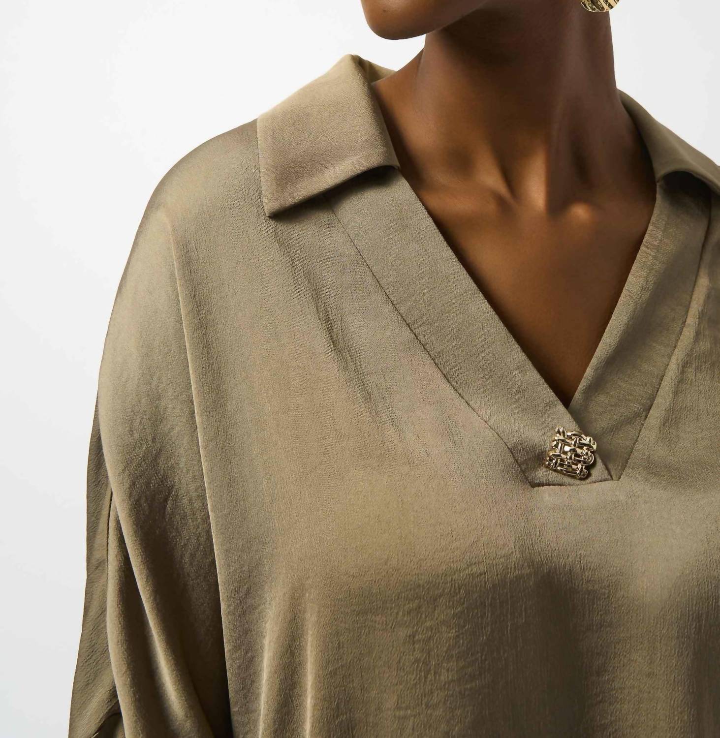 Pair this with your favorite jeans and slides for your next girls night out. Elevate your wardrobe with the Dulce Polo With Brooch by Joseph Ribkoff in an alluring Java hue, ideal for a touch of casual elegance. This blouse is crafted from 67% recycled polyester, offering a sustainable option with a luxurious hammered satin finish. Featuring long dolman sleeves and a crisp shirt collar, it boasts a V-neckline accentuated by a statement button, and sleek side slits for added movement. Garment length is 28" (71.12 cm) from the high shoulder point, complete with a pull-on design. Model is 5'9.5" tall and wearing a size 4/Small.