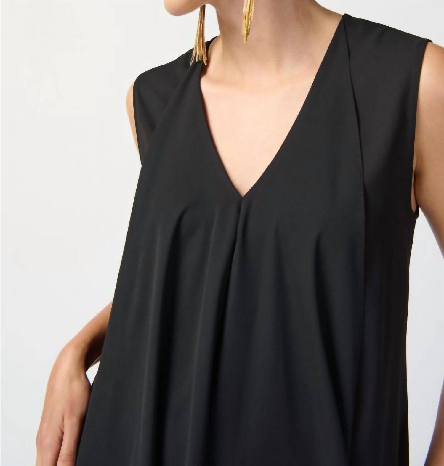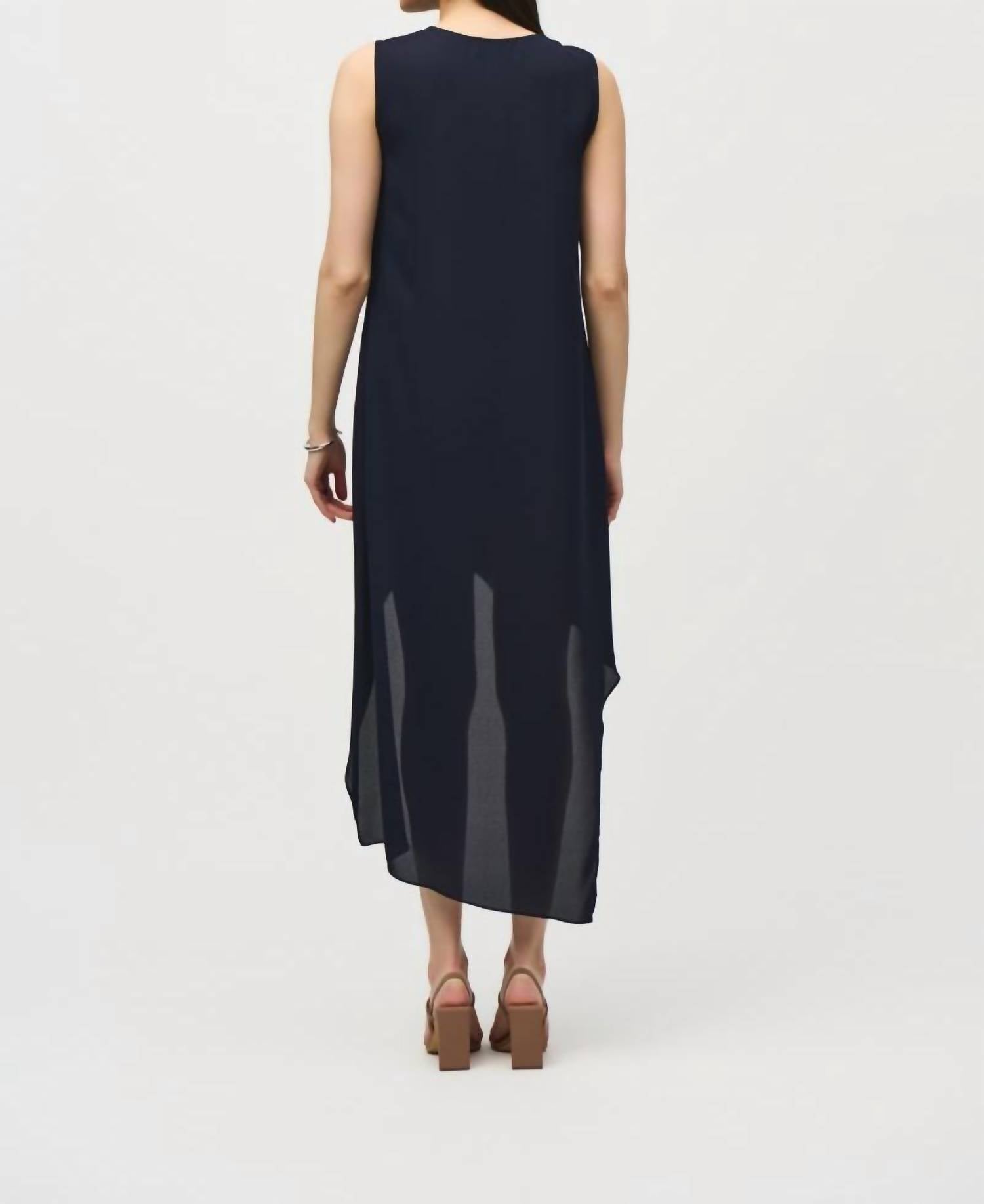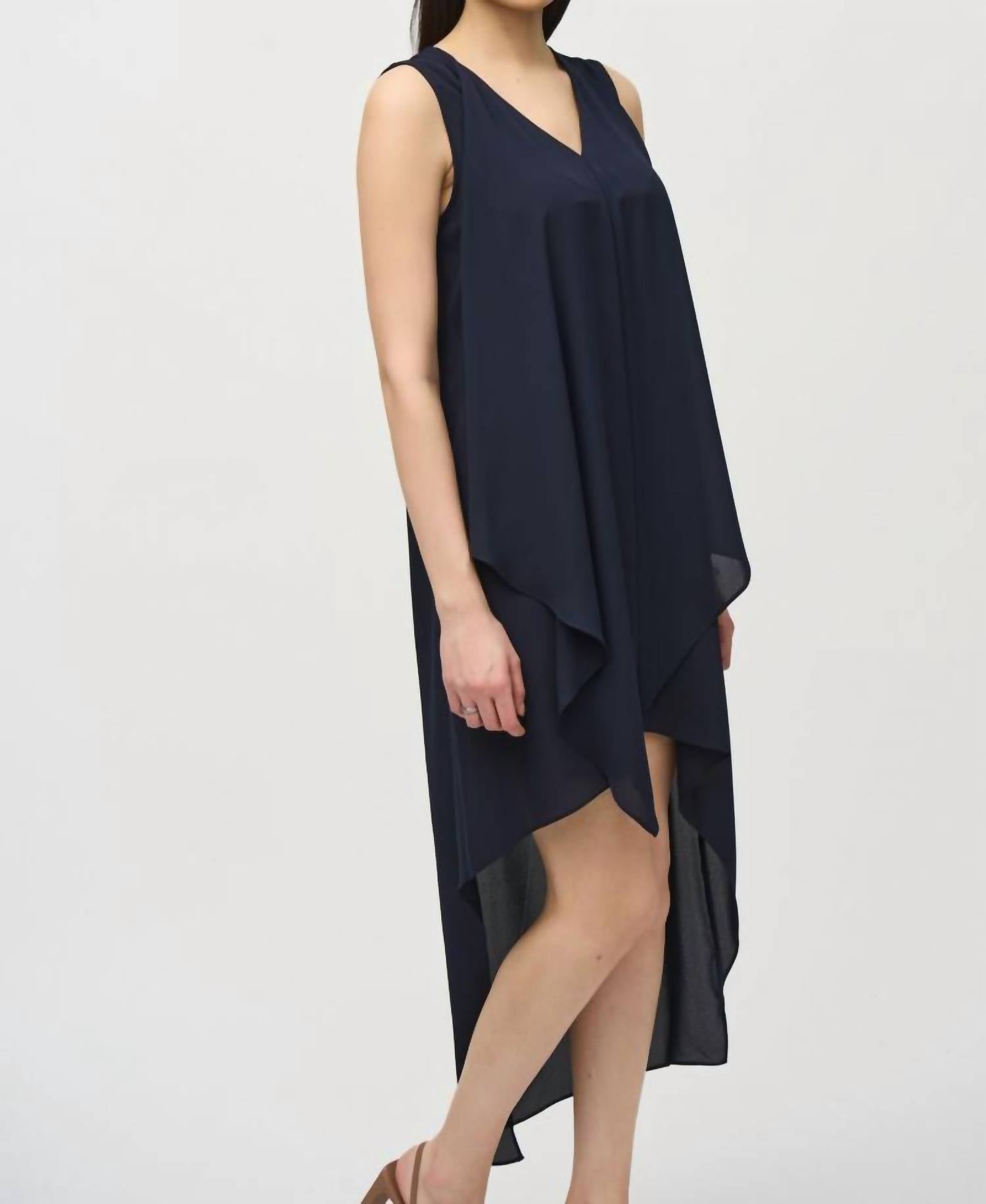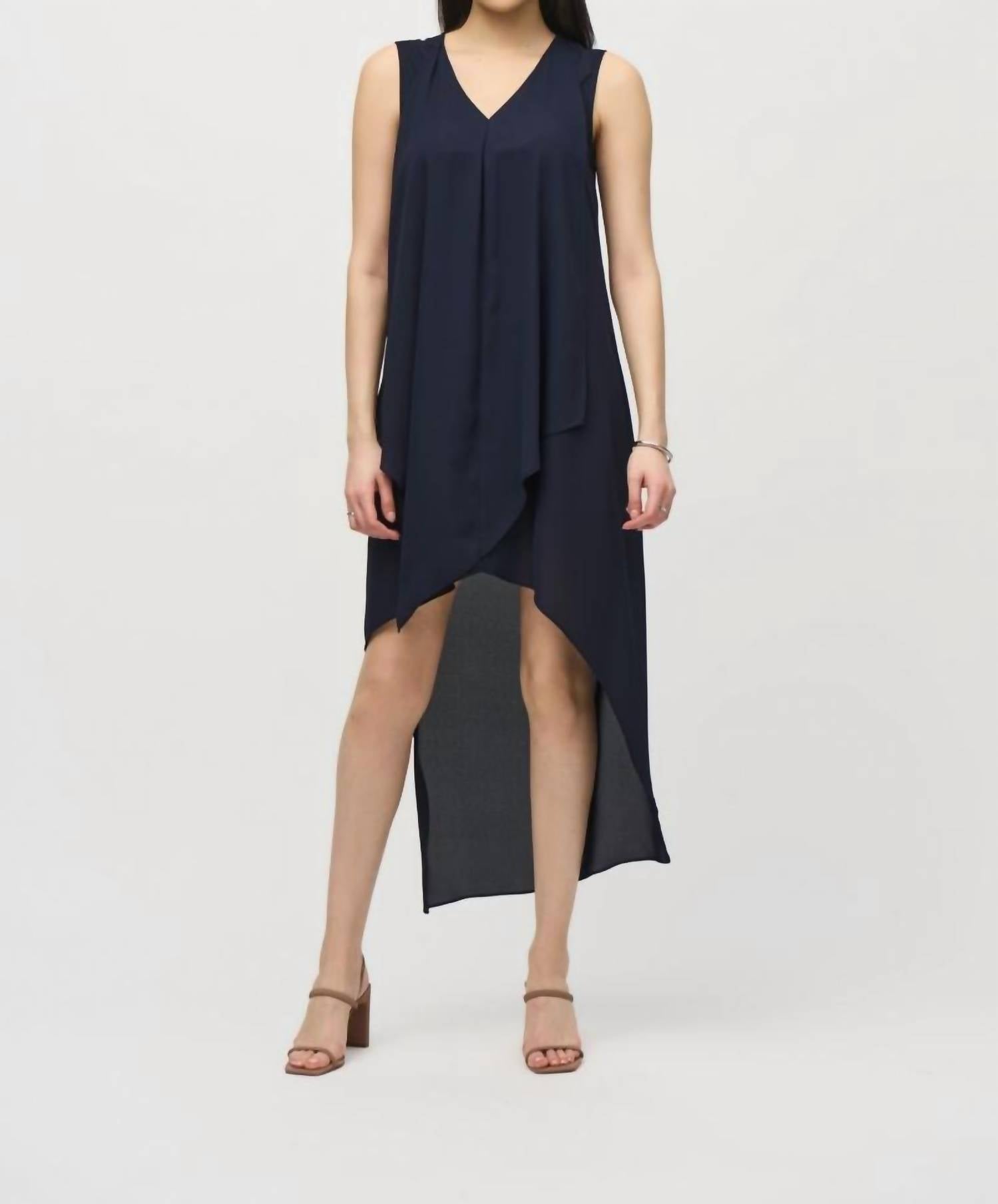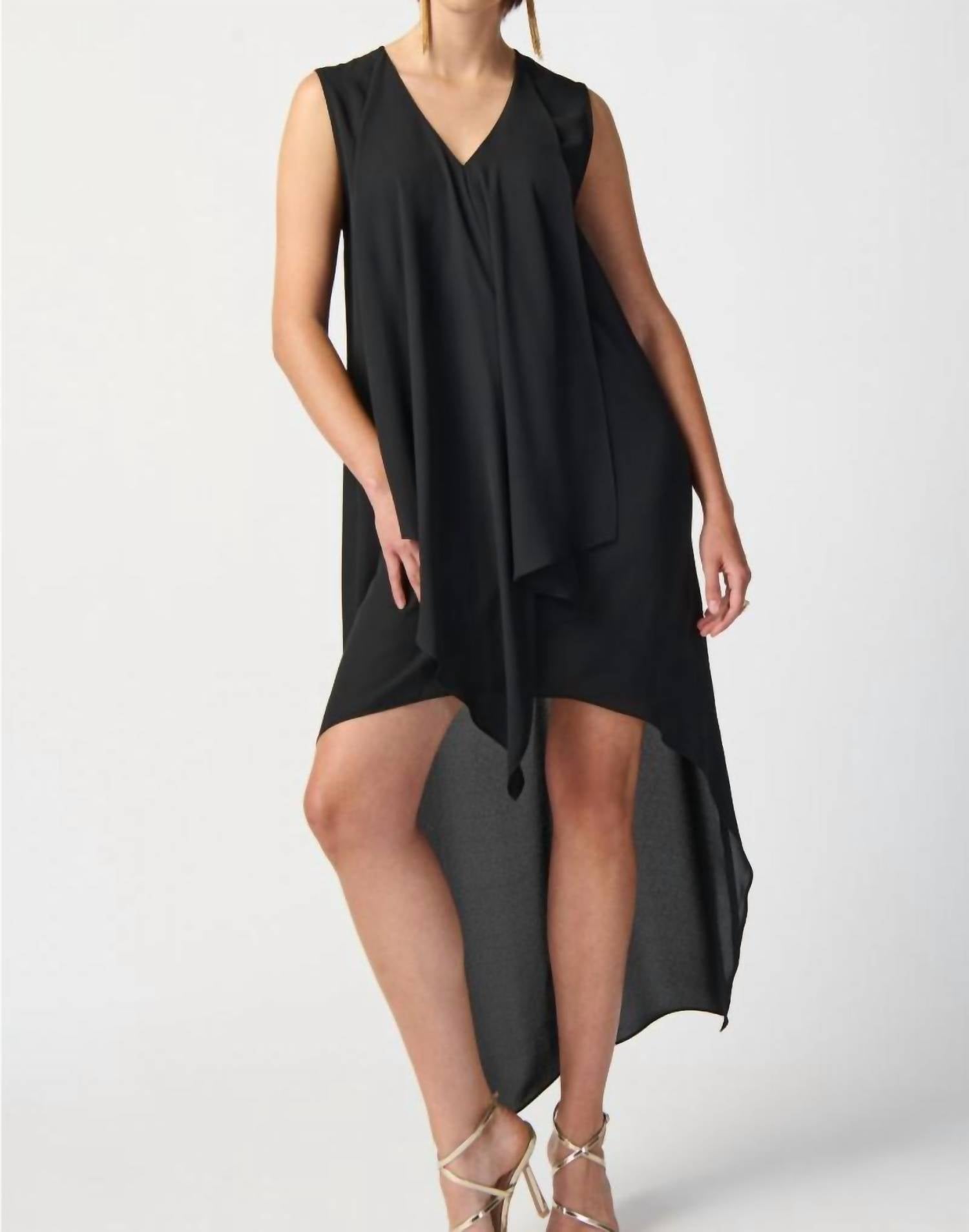 A cool twist on a classic style dress. The Joseph Ribkoff Pleated V-Neck Asymmetric Hi-low Dress in black is an exquisite choice for any formal occasion. This sleeveless dress is crafted from 100% polyester, showcasing a graceful ankle-length hi-low hem with pleated asymmetrical detailing. The pull-on closure enhances ease while the V-neckline adds a touch of elegance. Care is simple: Hand wash and lay flat to dry.