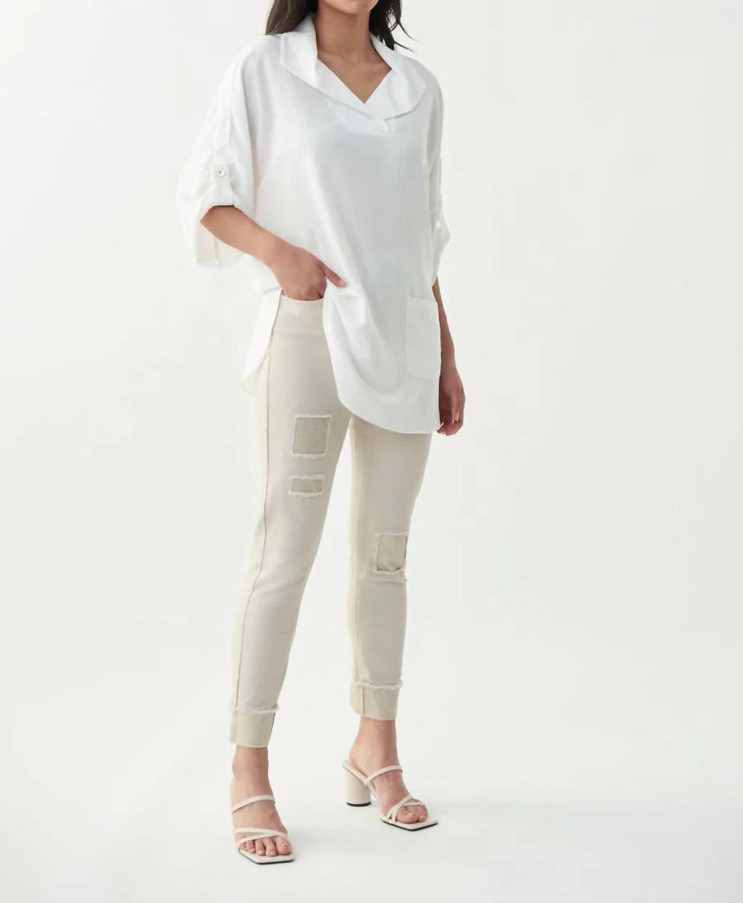 We especially love this cropped jean with a cute pair of slides or sandals. Elevate your style with the Rhinestone Tapered Jean by Joseph Ribkoff, designed in the chic Moonstone hue. Featuring a textured pattern and slim fit, these high-rise jeans offer a flattering tapered leg. Composition: 70% Cotton, 27% Viscose Rayon, 3% Spandex. Closure: Button closure. Care: Machine wash, tumble dry. Perfect for minimalist trends and travel occasions, especially during the spring season and Thanksgiving holiday.