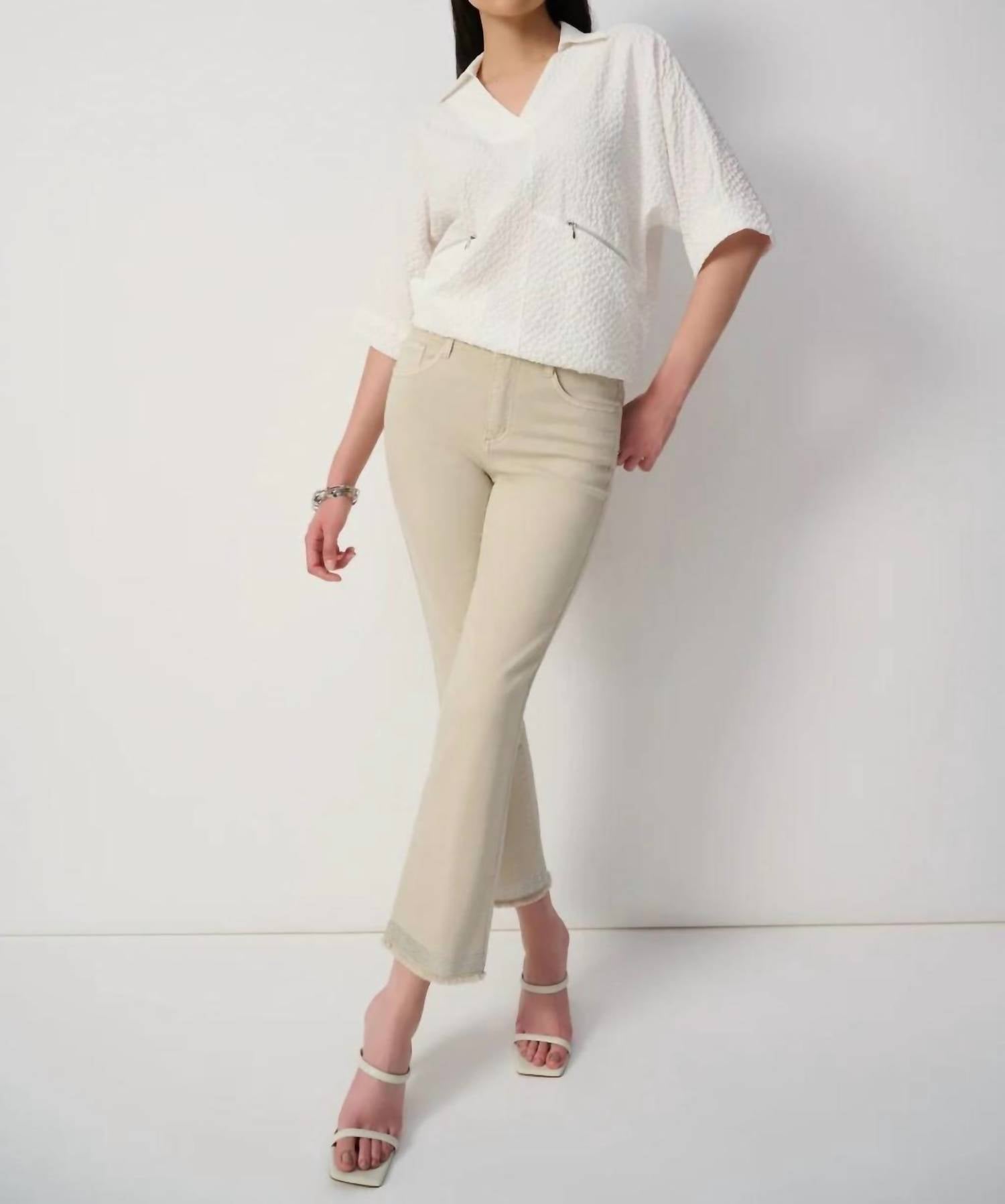 Pair these straight leg jeans with flats, sandals or even heels! You can't go wrong. Presenting the Classic Straight Leg Jean by Joseph Ribkoff, a bold addition to your wardrobe in the vibrant Moonstone color. With a cropped design, these jeans are made from 66% Cotton, 31% recycled Polyester, and 3% Spandex, offering comfort and style. Crafted in Canada, they feature a classic five-pocket layout and secure zip closure. Care for them easily with a machine wash and line dry.