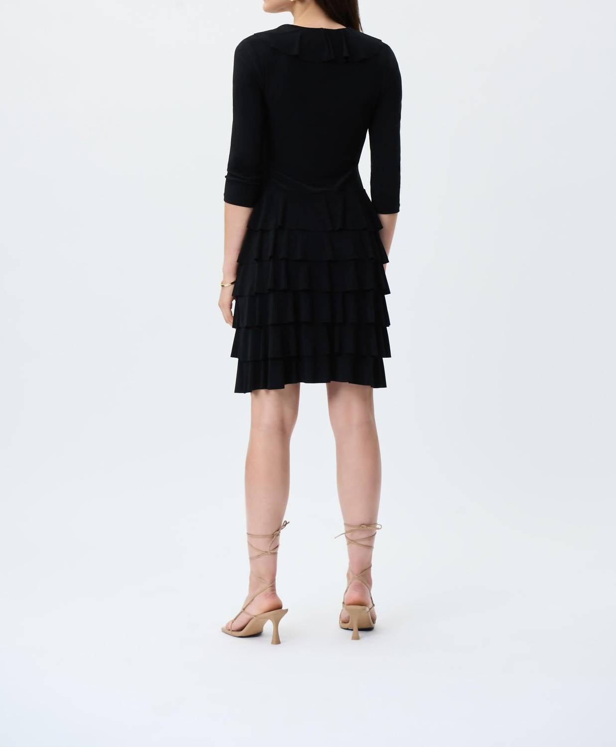Casual, comfortable and cute! The dress that you'll be reaching for all season long. Introducing the Joseph Ribkoff Ruffle Tiered Dress in classic black, a perfect fit for your springtime occasions. Featuring three-quarter sleeves and a V-neckline, this fit-and-flare dress boasts a solid pattern that exudes elegance. With its flowy silhouette, it ensures comfort and sophistication for any anniversary event. Enjoy a piece crafted for women who appreciate both style and ease.